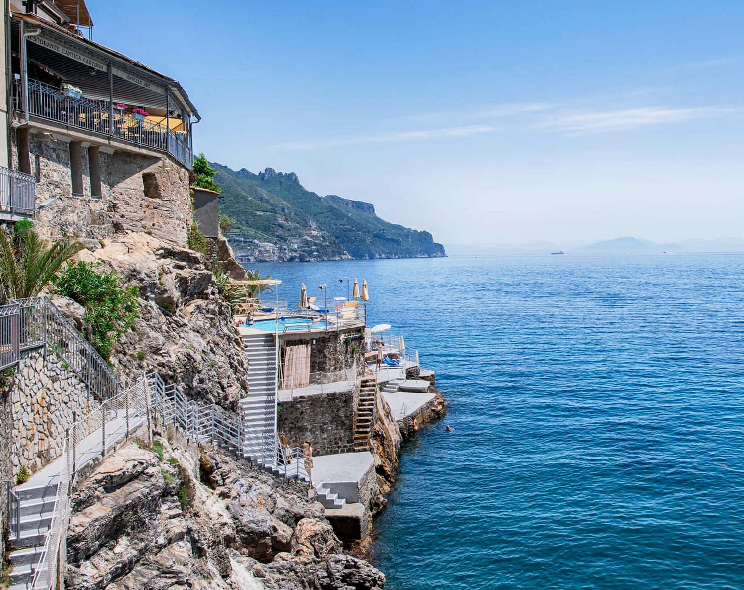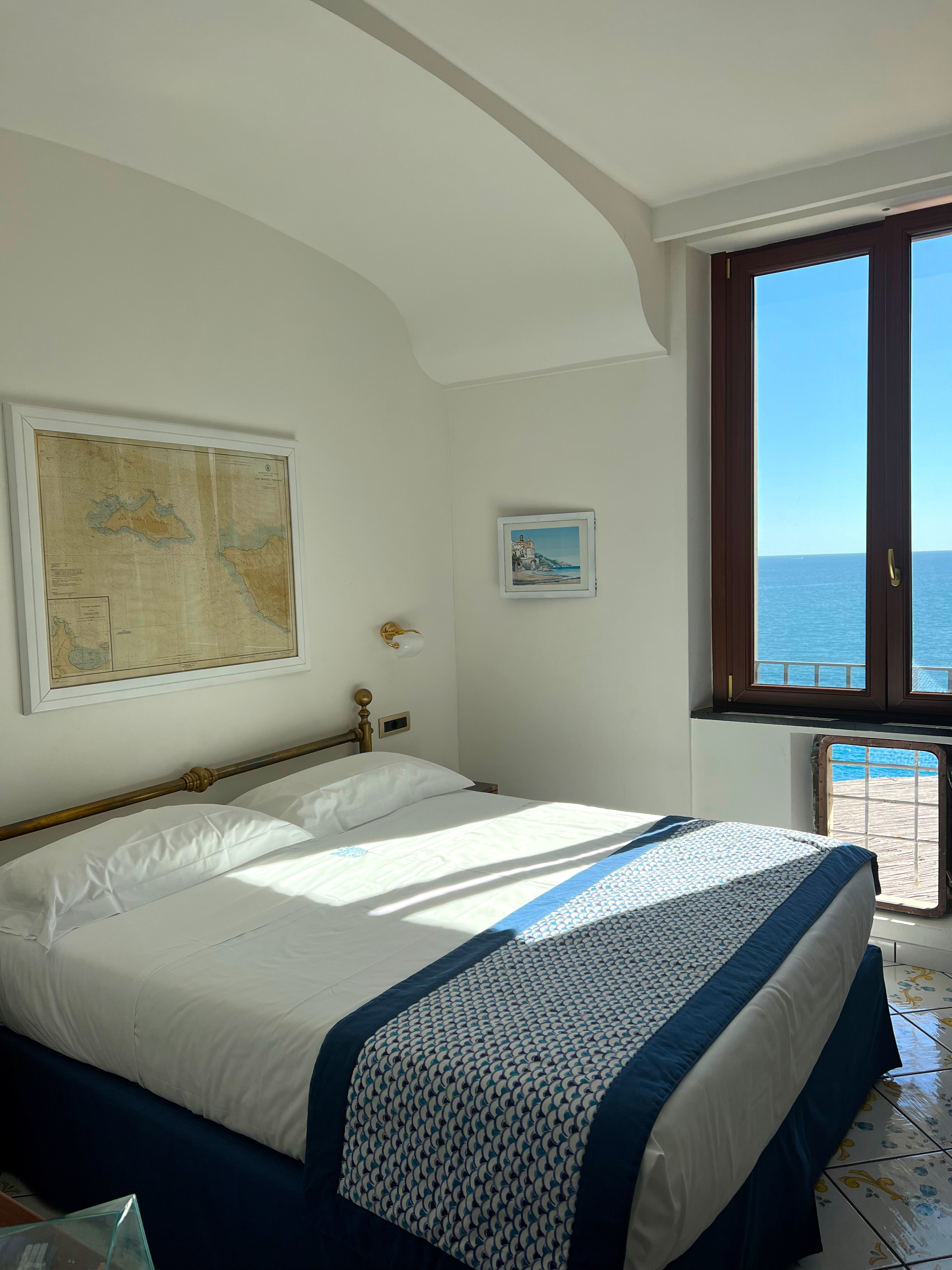 Perched on the rocky shoreline, this former paper mill-turned-boutique hotel is tucked away in a quiet inlet, surrounded by cascading cliffs and the endless shimmer of the Tyrrhenian Sea. It truly felt like discovering a hidden cove after a long sail—peaceful, private, and utterly enchanting.