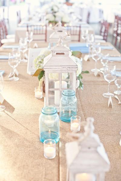 Combine a beige textured table cloth with whites and light blues for a beach feel. This creates a simple setting that you can't go wrong with.