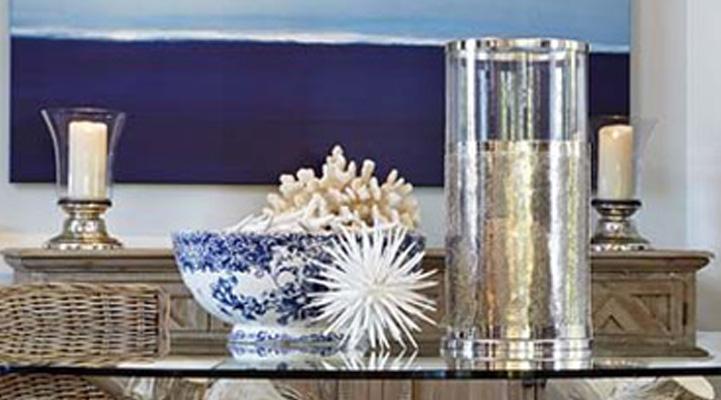 New England style coastal dining room with sea inspired accents and beach house furnishings. We s...