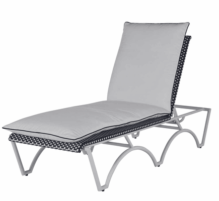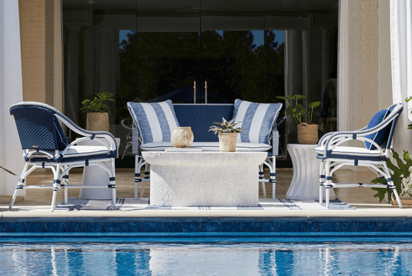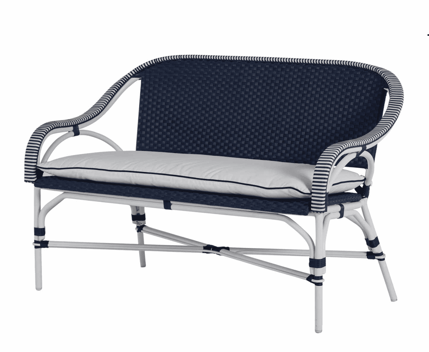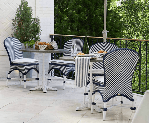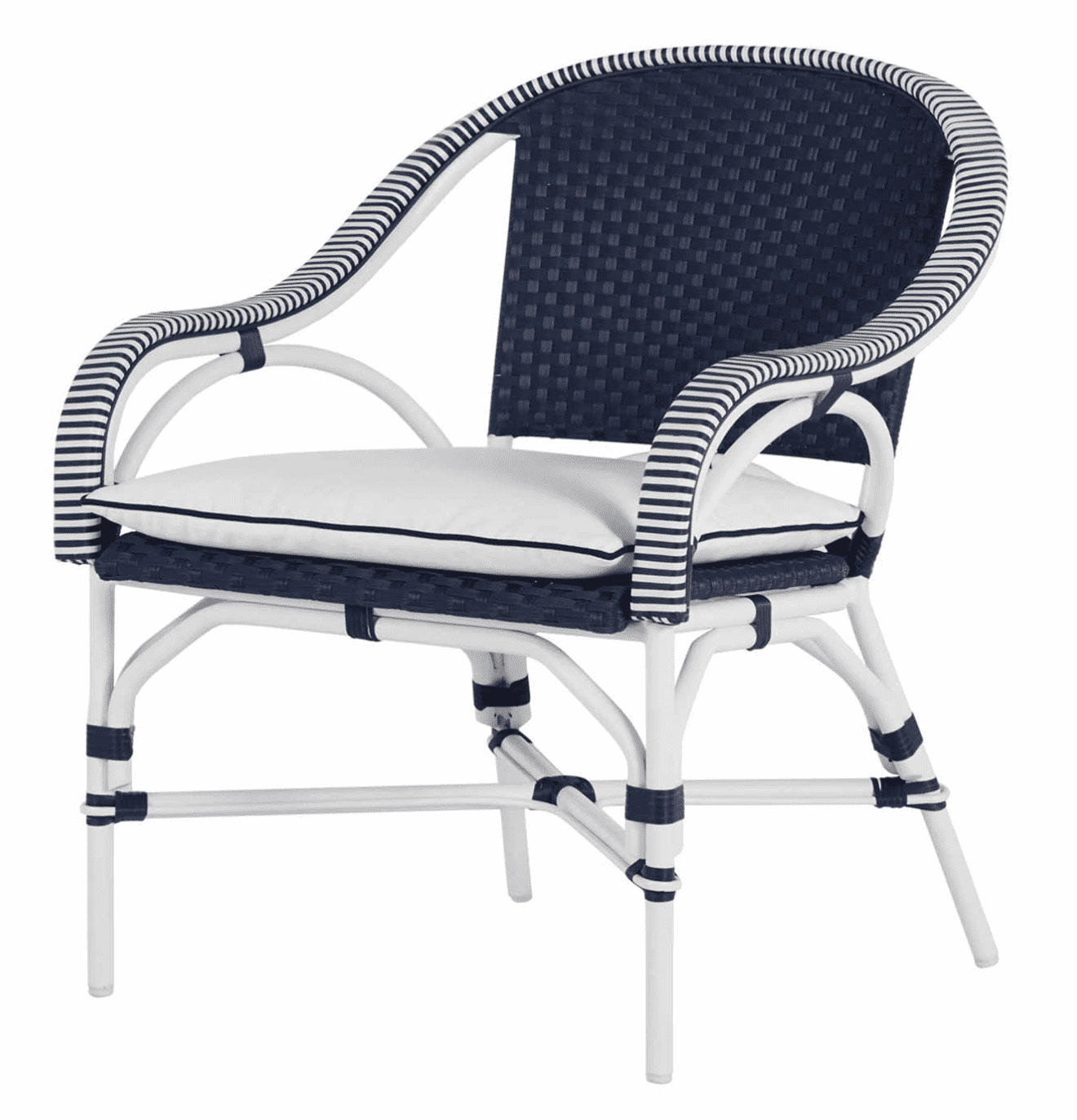 Seemingly transported from a French sidewalk café, this charming seating gets a fresh look with a White and Navy or White and Natural two-tone weave and Chalk-finish aluminum frame. Deep-seating styling provides comfort without a cushion, and the chair’s design makes it ideal for small spaces. Easy care and sturdy styling mean years of worry-free enjoyment.