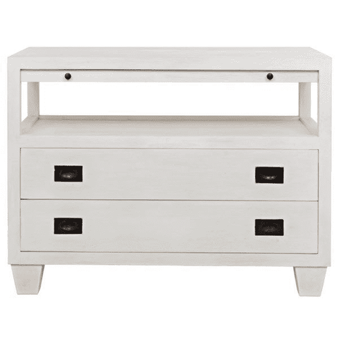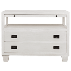 The Bella Bed Side Table is crafted from Mahogany wood painted with a white wash finish, this bed side table has two drawers with inset ring pulls, an open slot for books and additional storage as well as a convenient slide out tray with two small black knobs.
