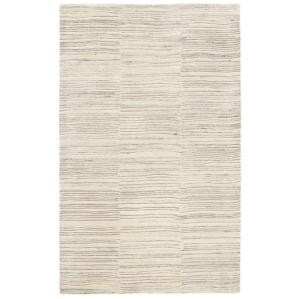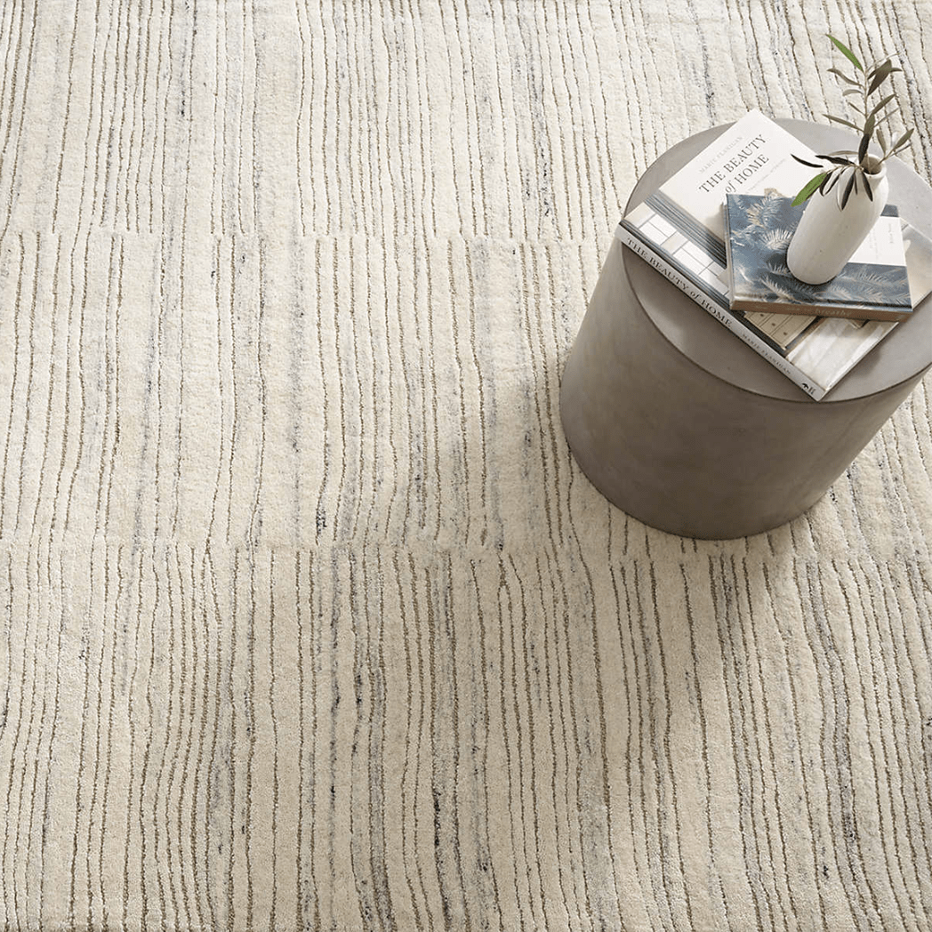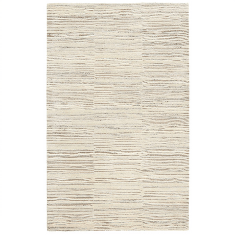 Inspired by substrate layers of sandstone sediments that chronicle the millennia, this luxurious, irregularly stripe wool rug will stand the test of time. The subtle degradations of a natural undyed fleece pile enhance the finely observed irregular striping in a softly mineral palette. The subtle beauty of the higher sheared tufts emphasizes the contrast of the densly looped stripes.