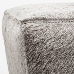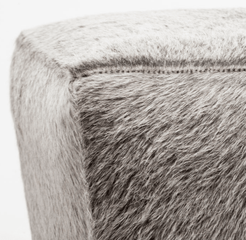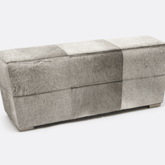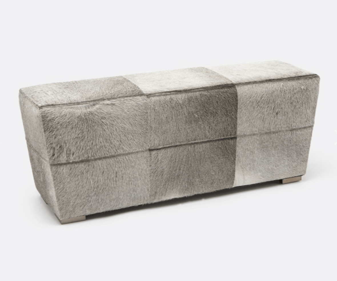 Our Baldwin is a materials masterpiece-plush panels are stitched together so that hair-on hide fully encases this bench. The substantial piece is a statement maker brass metal feet lighten its presence by adding a slight lift. Natural variations in this material may occur. Slight differences in color and texture are characteristics of this collection's aged full-grain leather. This durable, high quality leather may show inherent markings, distressed appearance, and variations in pattern.