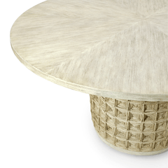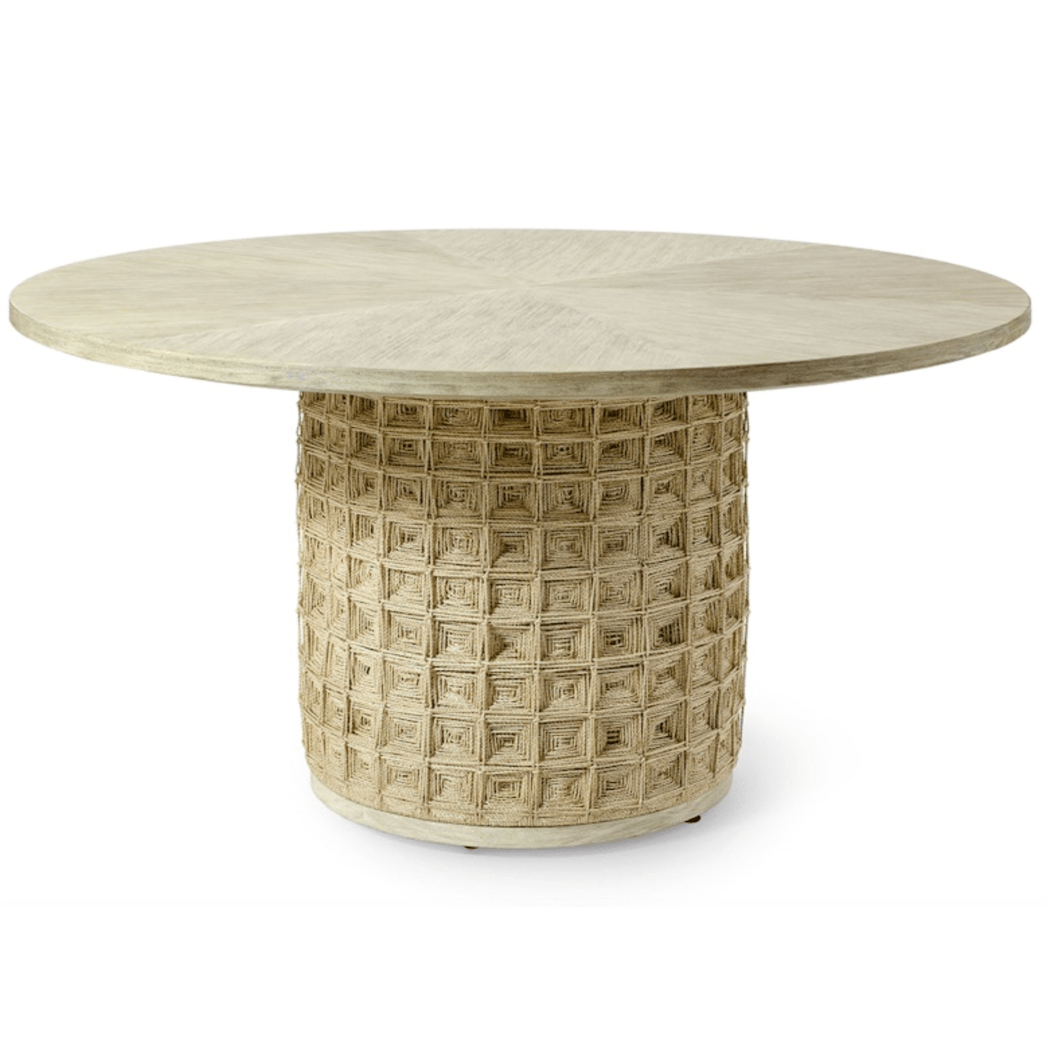 Hardwood frame, base, and tabletop with a cerused light white-wash finish featuring natural abaca rope hand-twisted and woven into a unique square design.