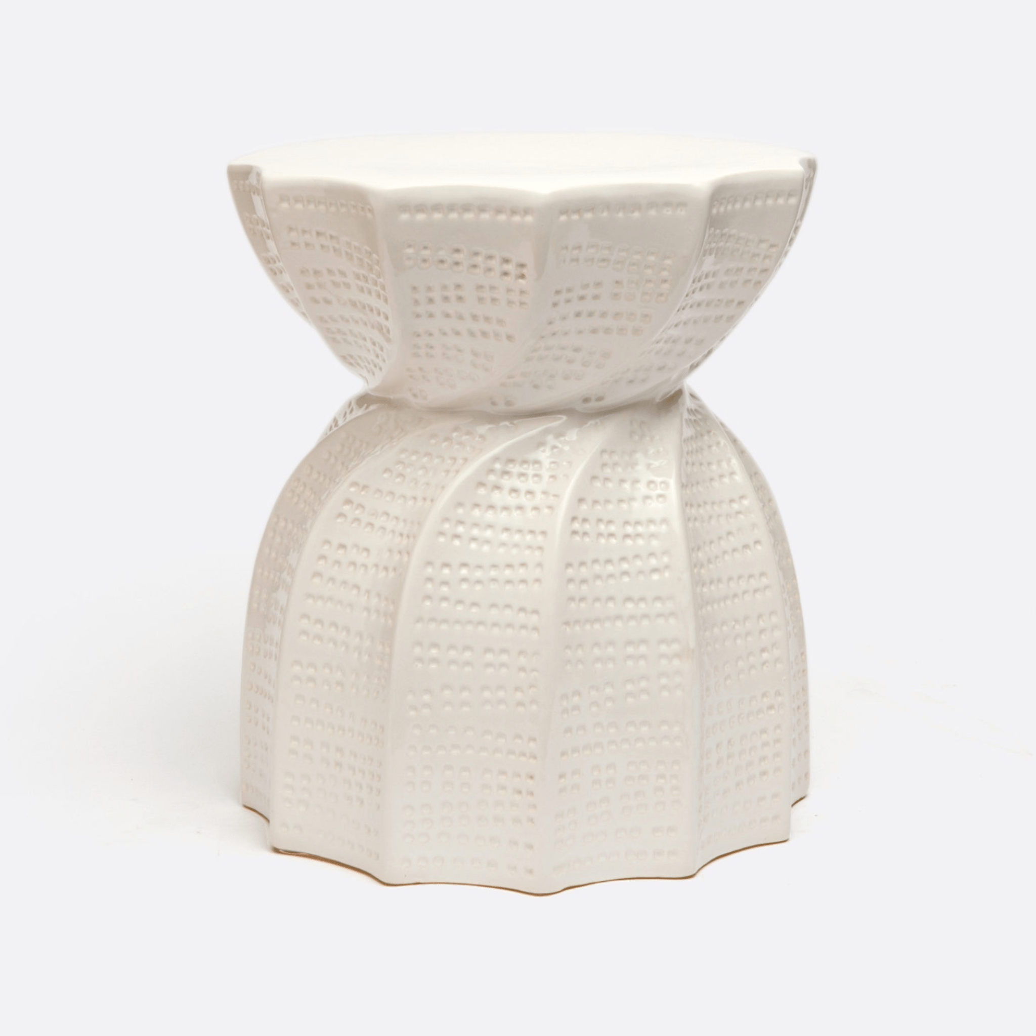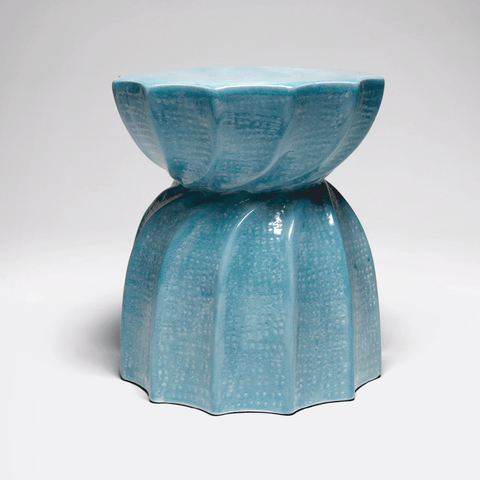 A fun, circular-shaped ceramic stool with cut out curves and a twist in the middle. Unique seating for indoors and out.
