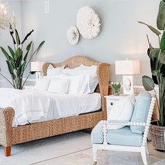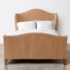 The Bermuda Bed is made of woven sea grass that creates the chunky knit look of this fine, impressive coastal bed. Headboard and footboard have a wing detail adding to the classic, casual aesthetic thanks to the bed's natural main material, which balances the formal silhouette. Natural Sea Grass compliments any bedside pieces, dressers and chests.