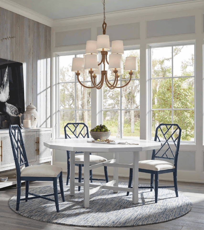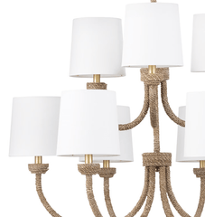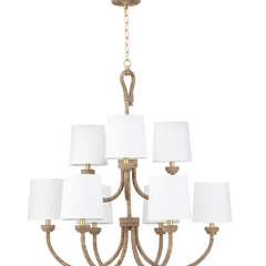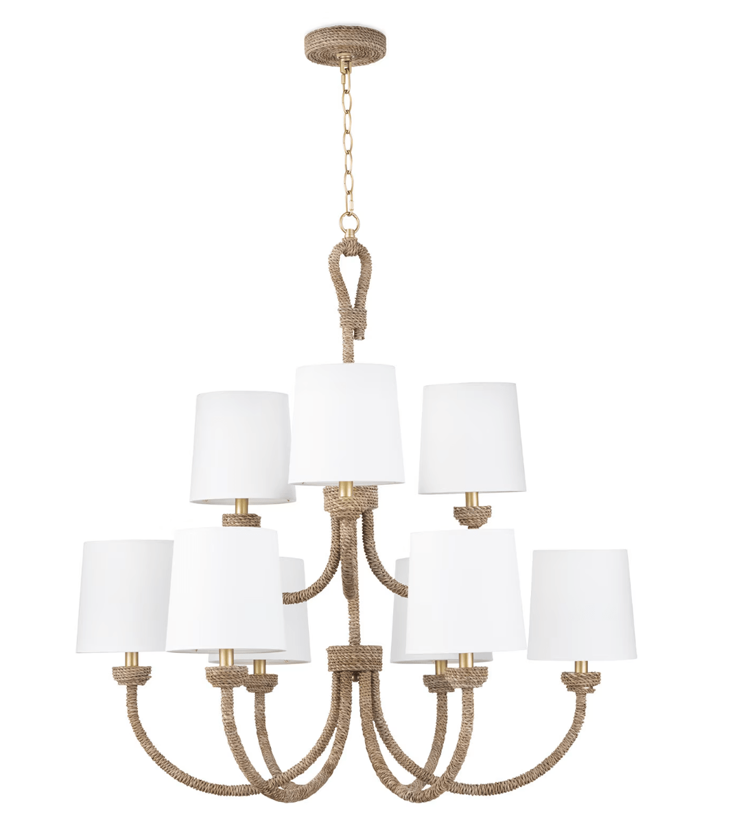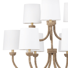 Natural woven seagrass provides a "washed ashore" look on the Bimini large chandelier. Looped detailing provides a nautical touch, while nine natural linen shades tailor the look. Install above a dining room table in a coastal or rustic kitchen to tie its design together.