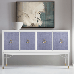 Refined and elegant, this sideboard features a crisp white frame accented by textured blue grasscloth-paneled doors for a touch of coastal sophistication. The gold ring hardware and delicate leg detailing, complete with brass-capped feet, add a luxe finish. Perfect for stylish storage in a dining room, entryway, or living space, this piece effortlessly blends modern design with timeless charm.