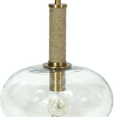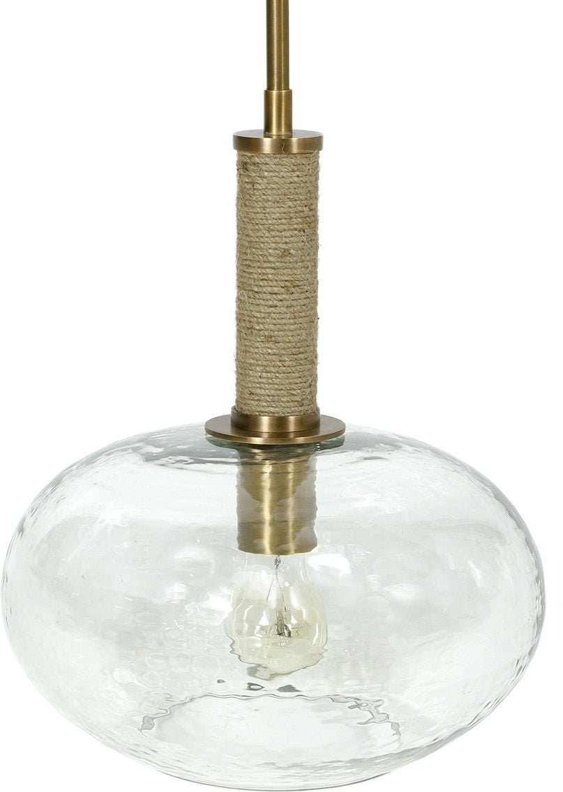 Fully adjustable pendant features a hand-blown rippled glass shade accented with natural jute rope. Antique brass metal finished canopy kit includes 1 x 24" rod, 2 x 12" rods, and 1 x 3" rod for customizable hanging heights. Professional installation is recommended.
