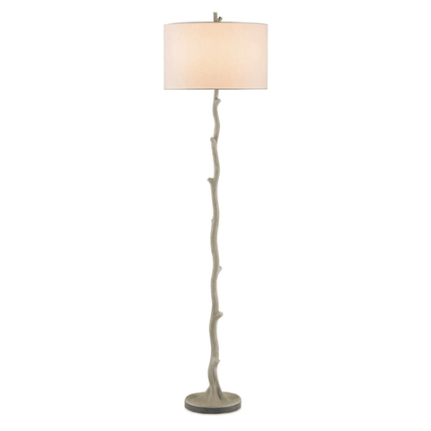 The faux wood stem of the Bridgewater Floor Lamp was fashioned to resemble a slender sapling. Made of concrete with a polished surface and wrought iron in an aged-steel finish, the gray concrete lamp is topped with an off-white linen shade.