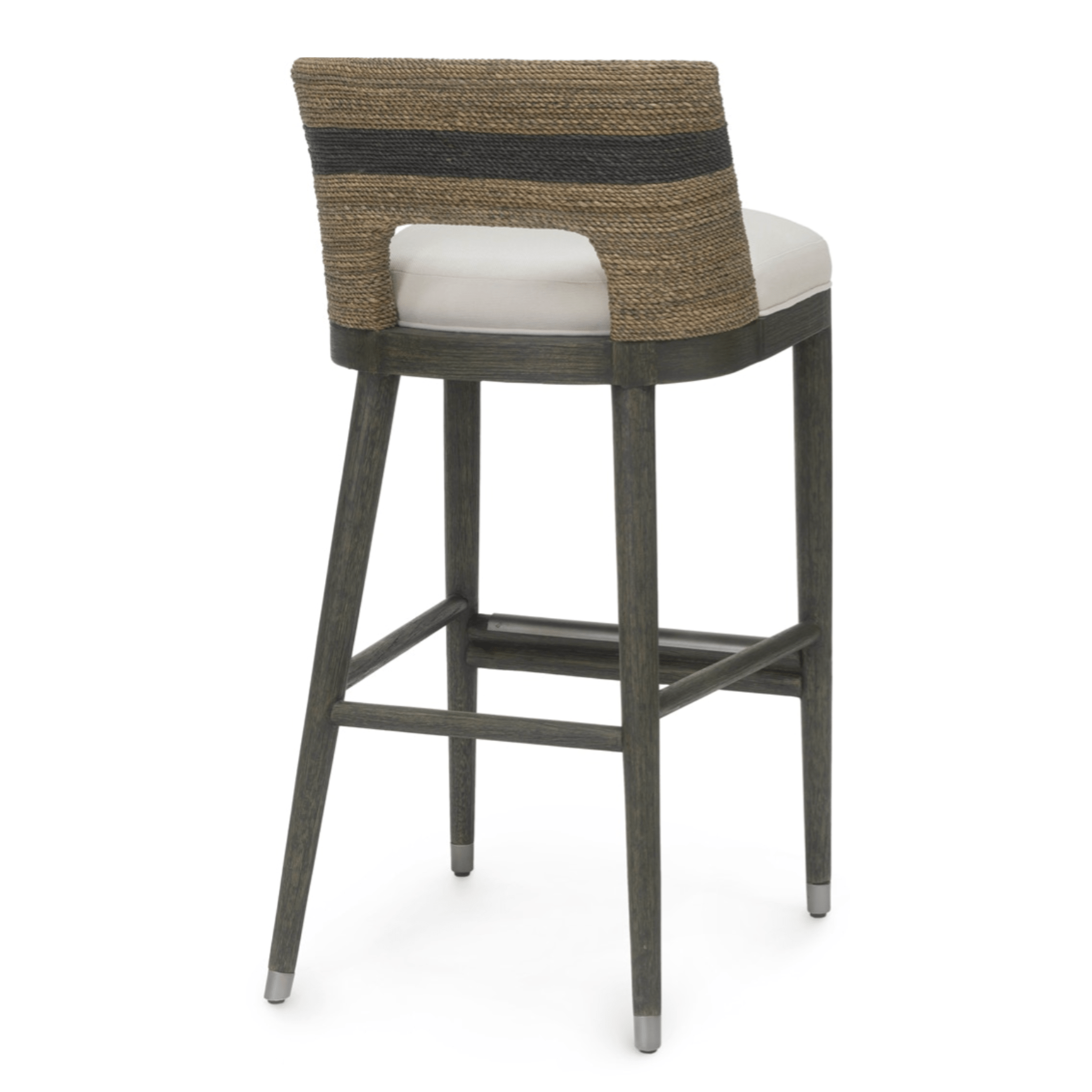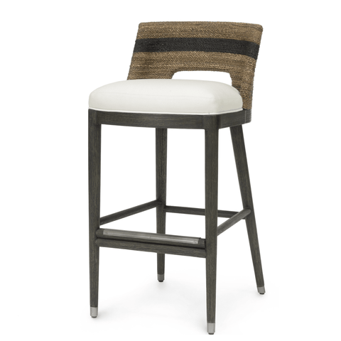 Hardwood frame and legs in grey with pewter finish foot caps and footrest on front stretcher with a double wall back of hand-twisted lampakanay rope in a grey finish with black stripe detail. Barstool comes with a fixed upholstered seat.