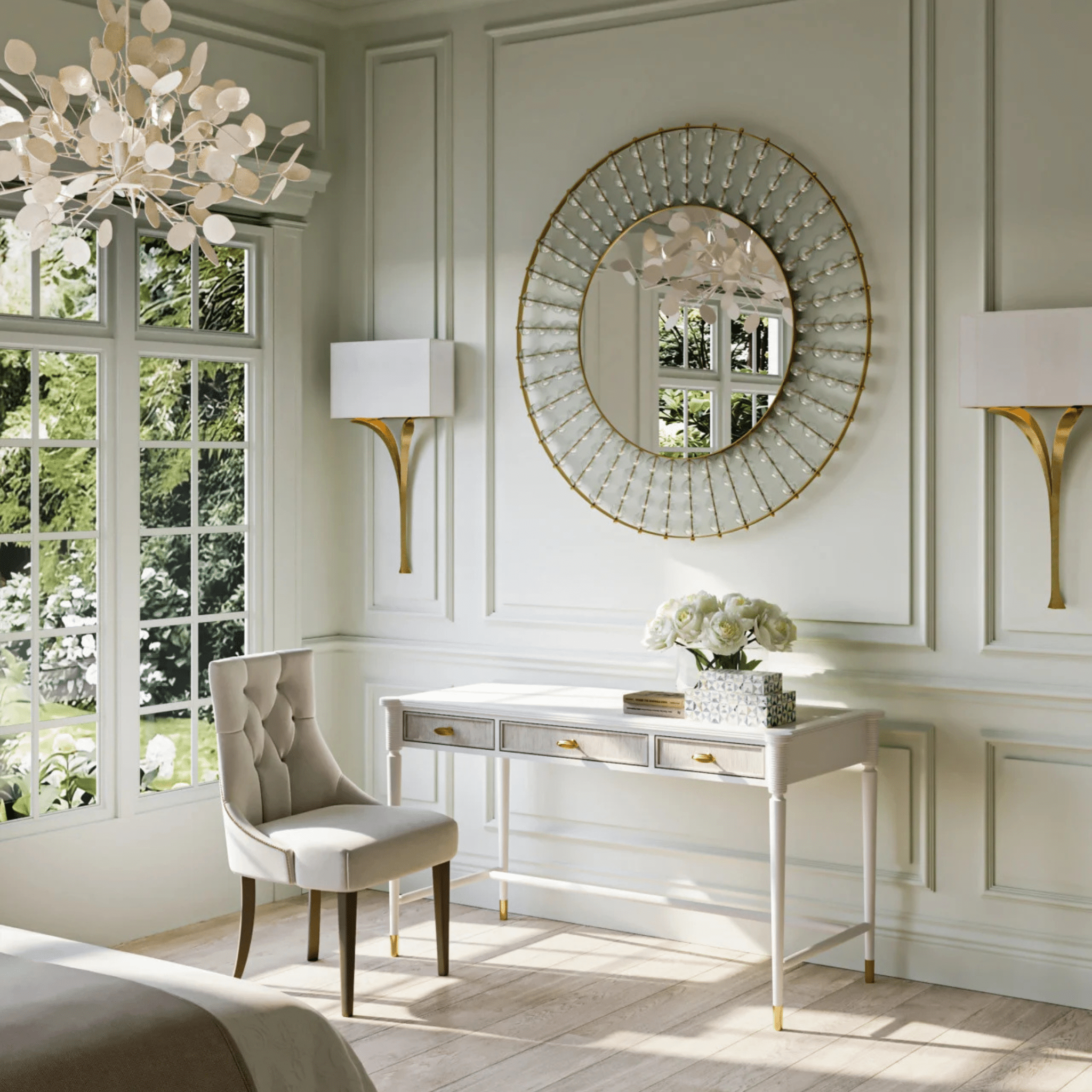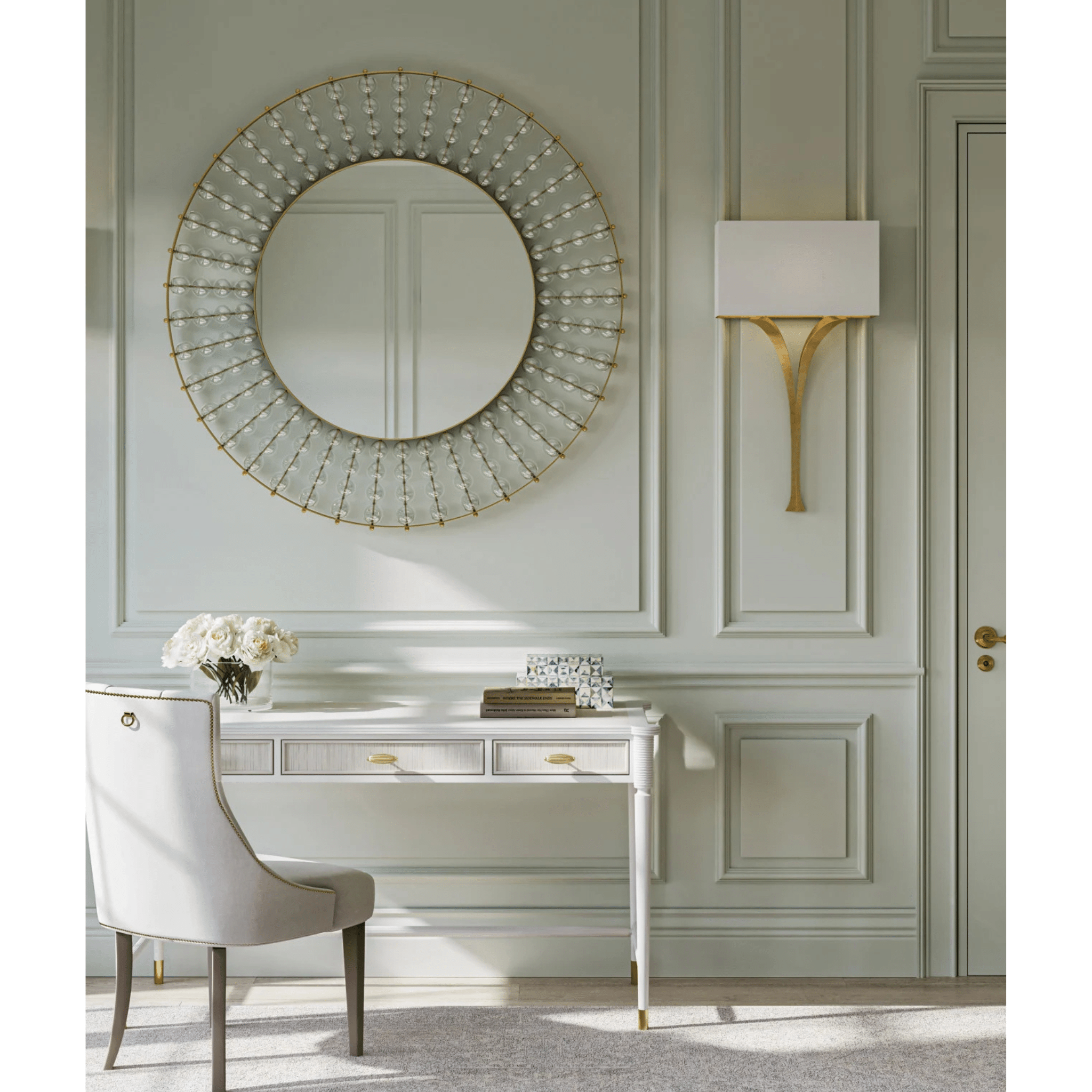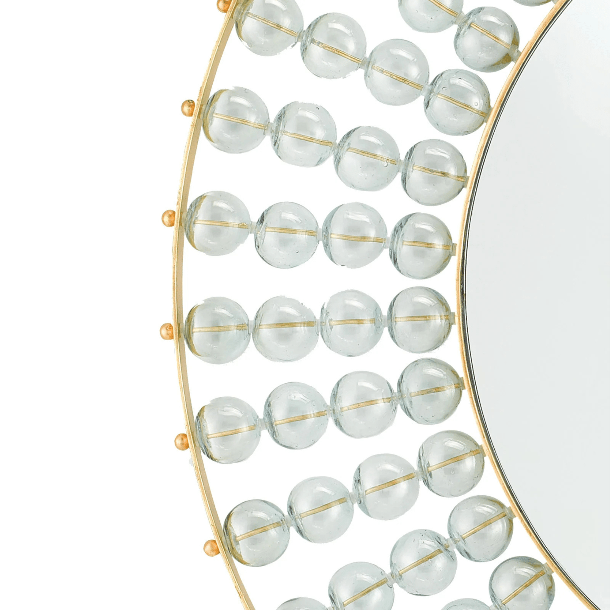 Threaded between the metal rings in a gold leaf finish, the hollow recycled glass balls make this glass mirror glint.