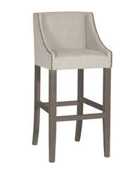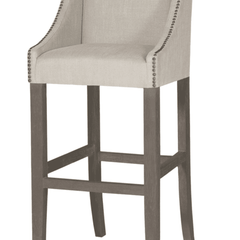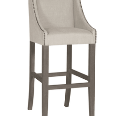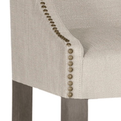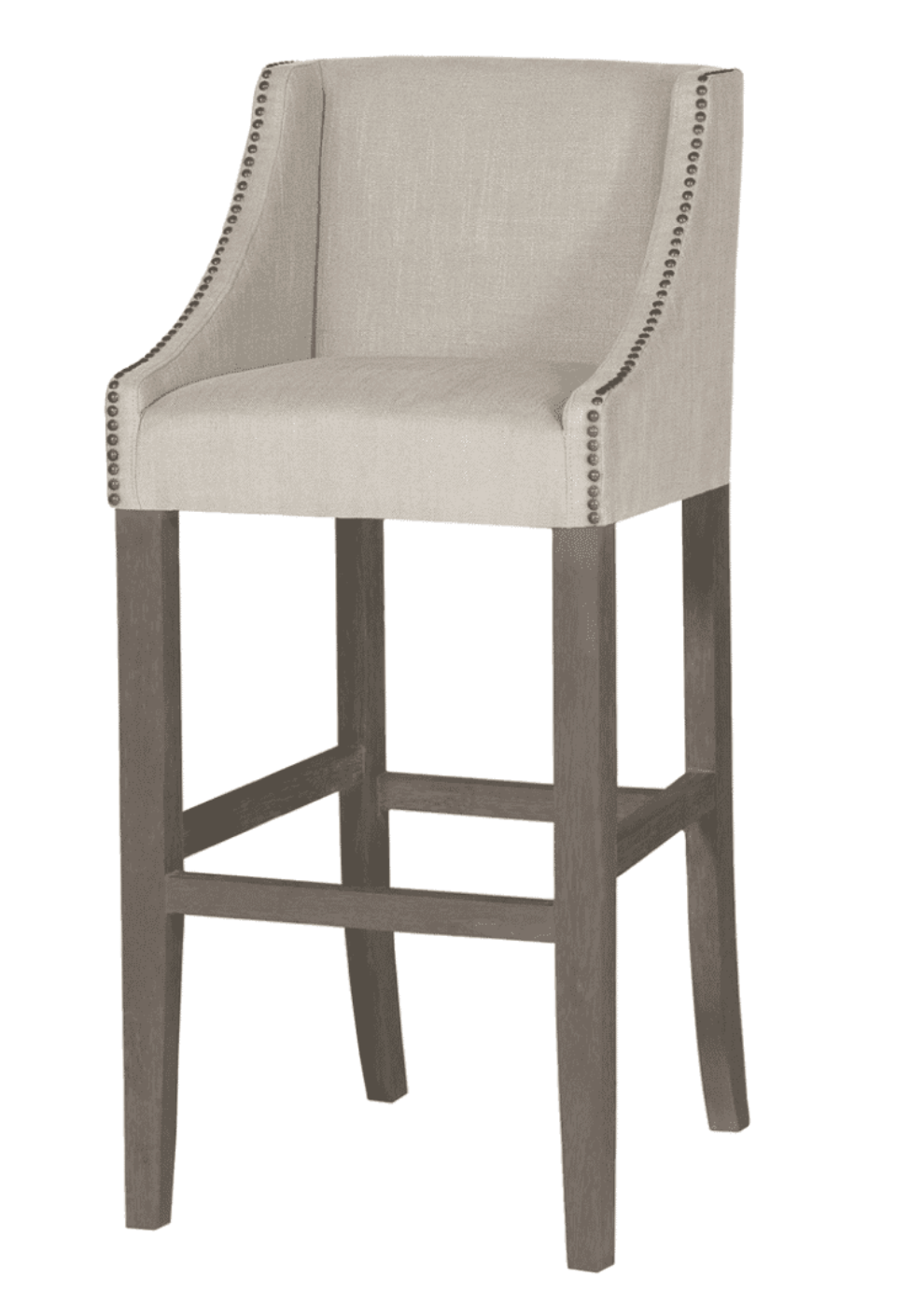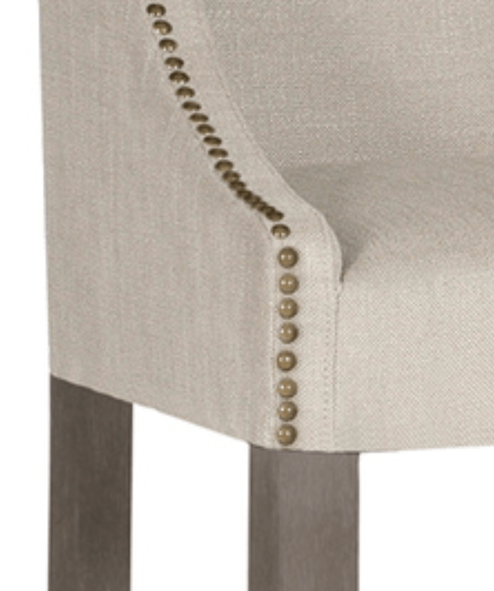 The Cambria Counter Stool is both sturdy and stylish. Classic design elements like antique brass nailhead trim and softly sloping arms on a solid oak frame are upholstered in exclusive Sunbrella Linen Dove fabric. Perfect for the kitchen island for casual dining.