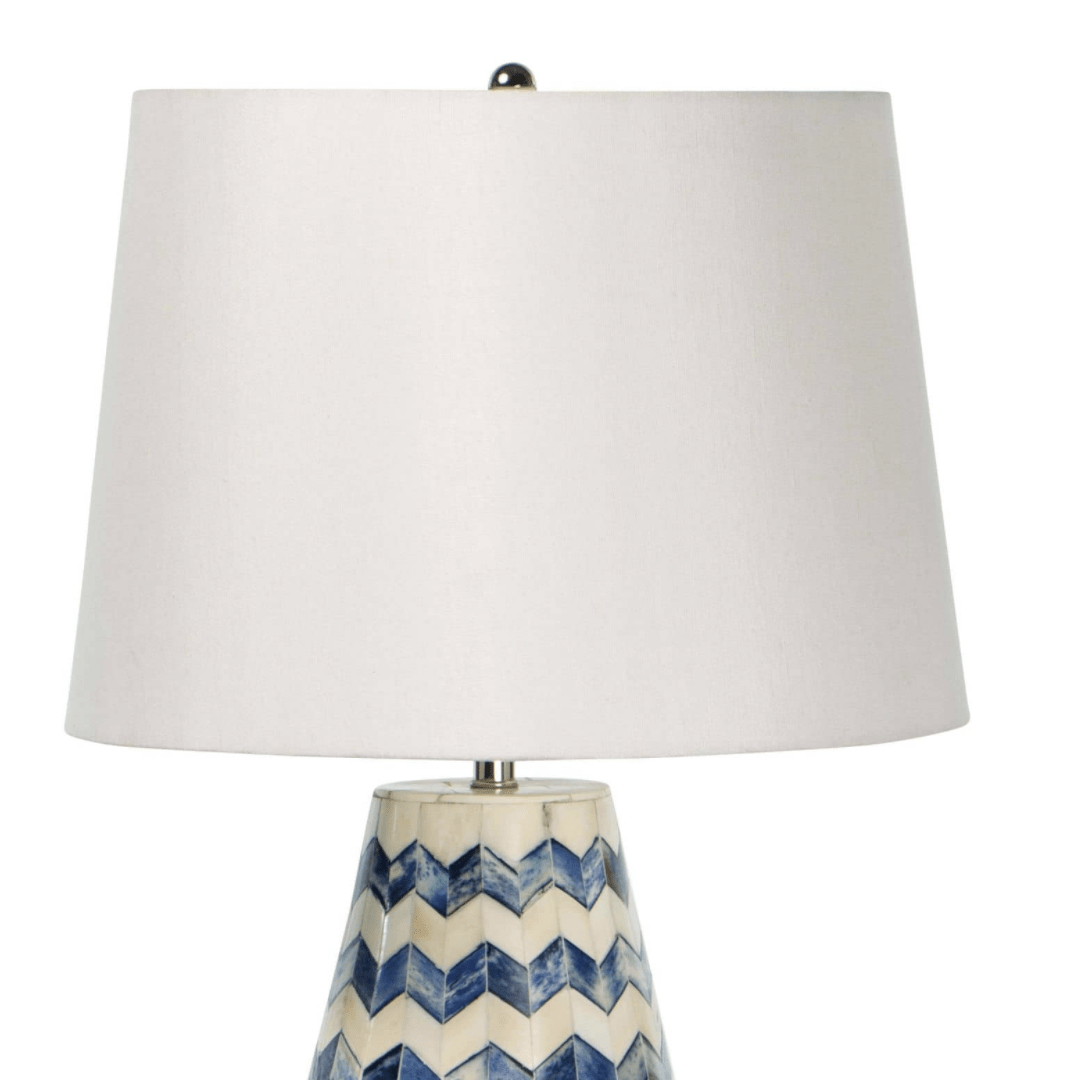 Pattern play has taken place with the complex inlayed bone pattern is hand made but at the same time so chic. This boho style lamp makes an eclectic room feel even cooler. All the elements of this unique lamp come together perfectly: the intricate inlaid bone, the classic chevron pattern, the soft shape, the linen shade. Alternating between indigo and white, its familiar pattern and classic shape is a welcome addition to any space.