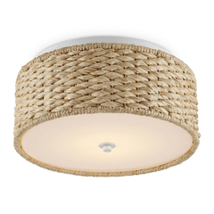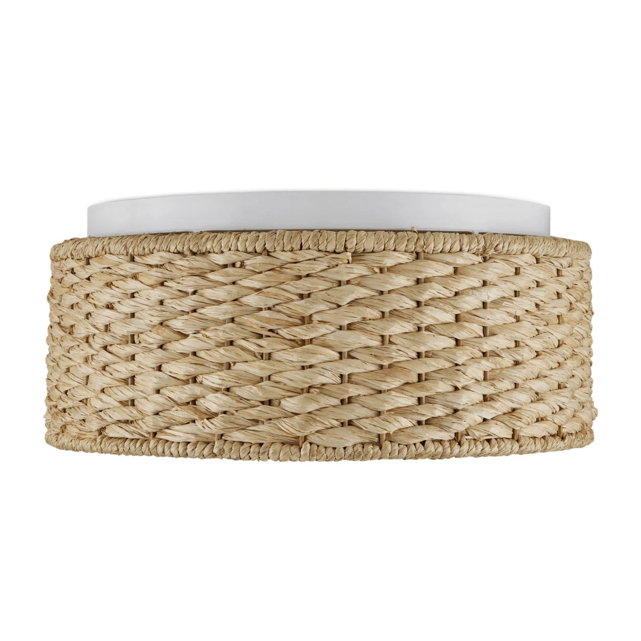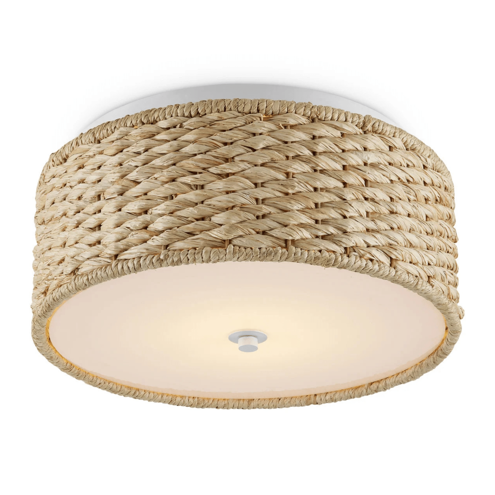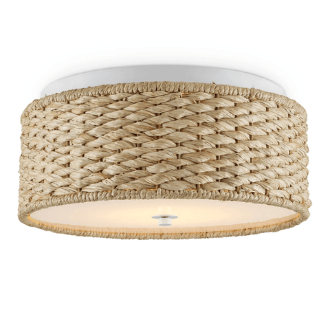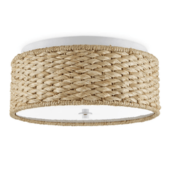 Raffia is densely woven around the circumference of the Colchester Flush Mount. Clarence Mallari designed the rope flush mount to be luminous. Choices that enhance the glow include the sugar white finish, the acrylic diffuser, the way the light flows onto the ceiling, and the weave that allows light to seep through.