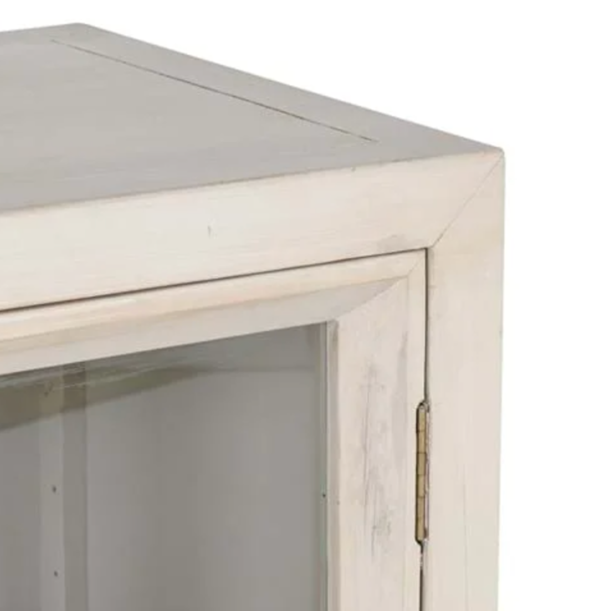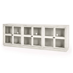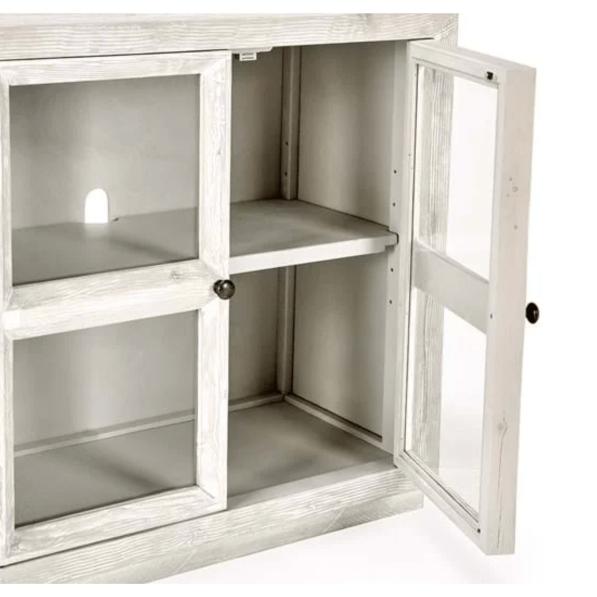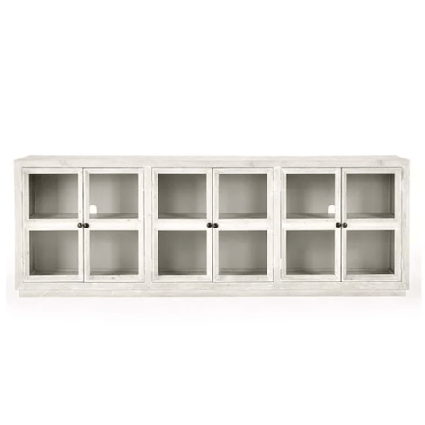 The Copenhagen Sideboard has it all! Uniquely crafted from reclaimed pine and tempered glass doors finished in a warm ivory with exposed wood grain. This unit has adjustable shelves and back panel access for any type of cord management. The doors are inset with mullioned glass adorned with antique bronze knobs.