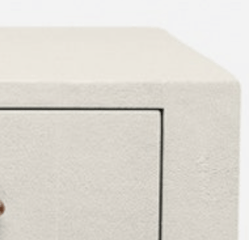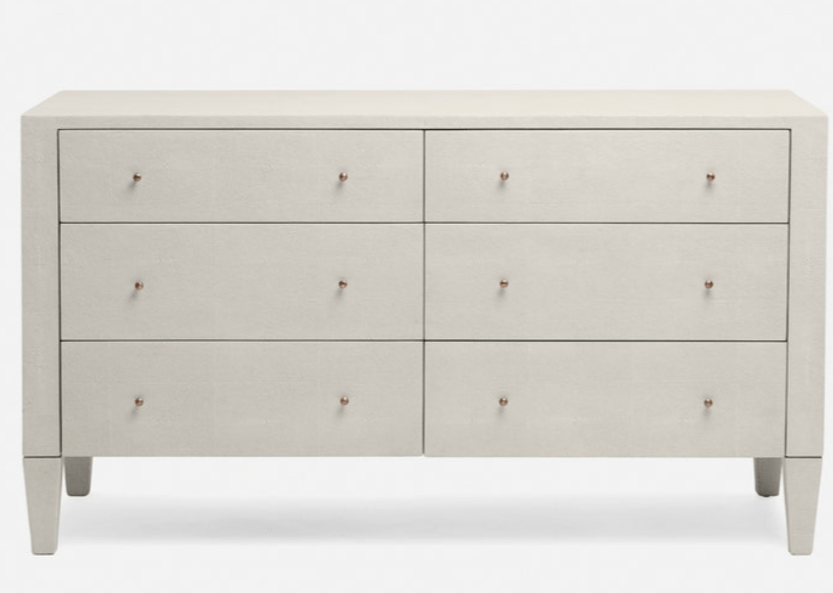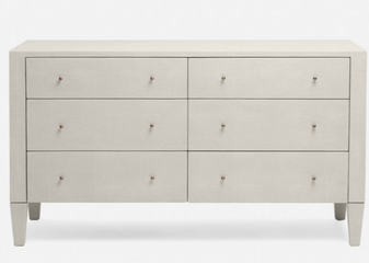 Materials define our classic look of the Moonstone Bay Dresser. The piece is fully wrapped in faux shagreen with fine, subtle brass hardware and finished with bottom mount soft glides on each drawer. Plentiful drawers inset into the frame for a flush profile.
