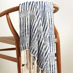 Tribal stripes of slubby navy are satin stitched in bands on a white handwoven cotton blanket for a soft beach-inspired take on ethnic patterning. A beautiful braided fringe adds to the Moroccan context.