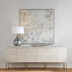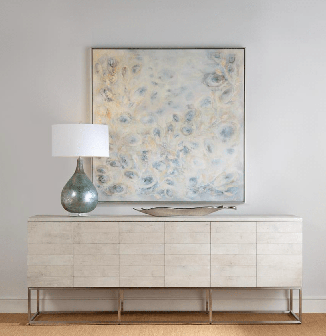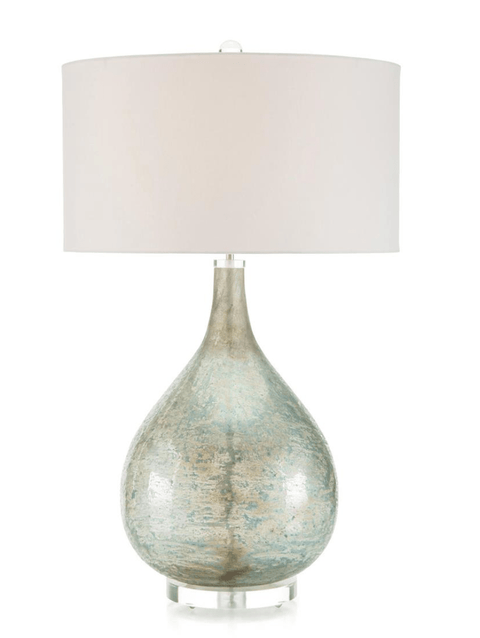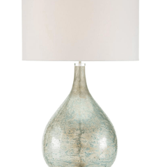 Varying tones of deep seaglass blues with aqua tones make this an exceptional table lamp, accented with a clear acrylic base. When illuminated, the light filters through the clear acrylic top, slightly illuminating the glass.