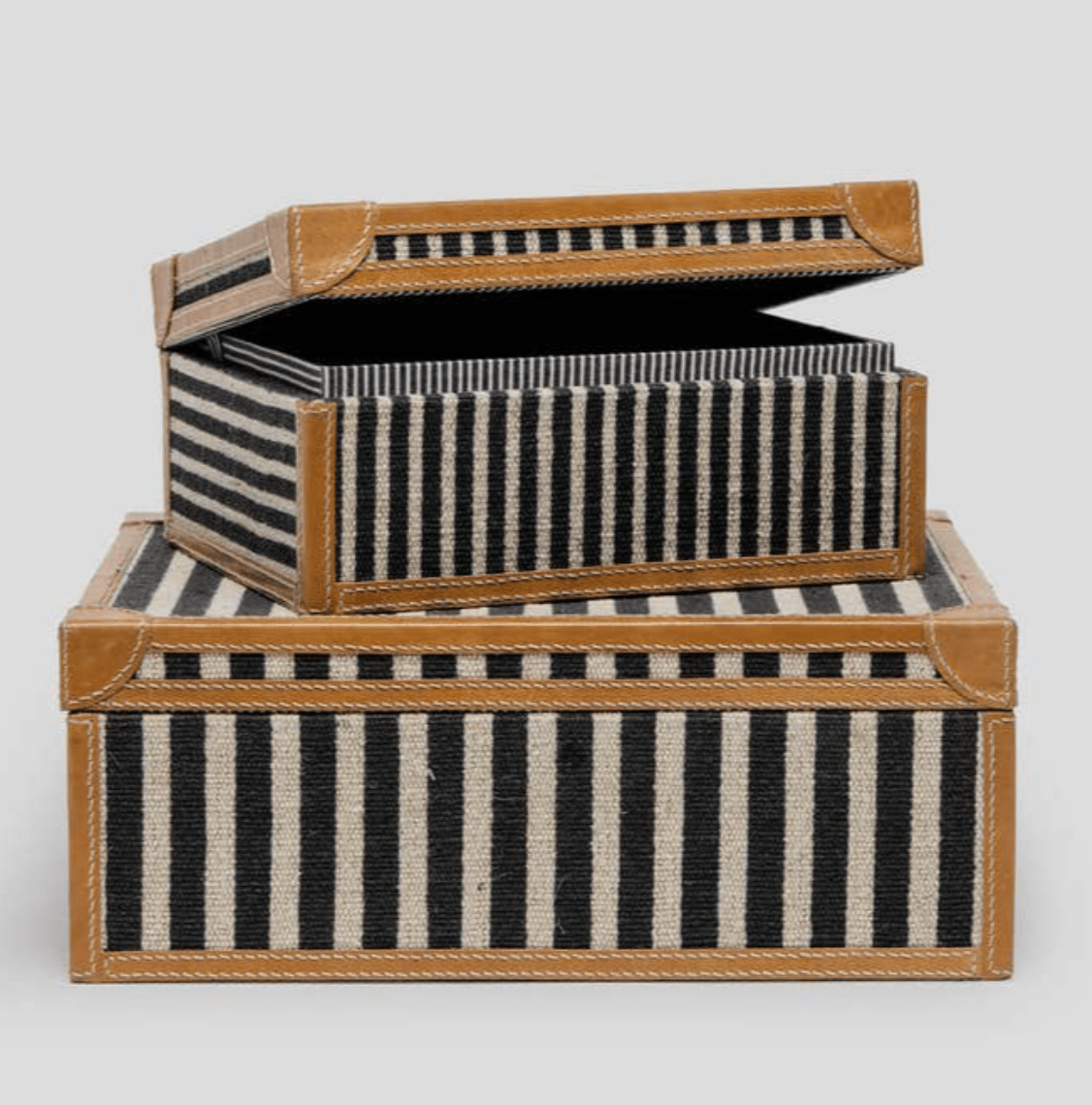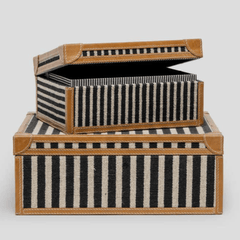 Nautical striped canvas with camel leather borders, make the Denby Box Set a sure winner. Perfect for storing remotes, watches, cufflinks and more.