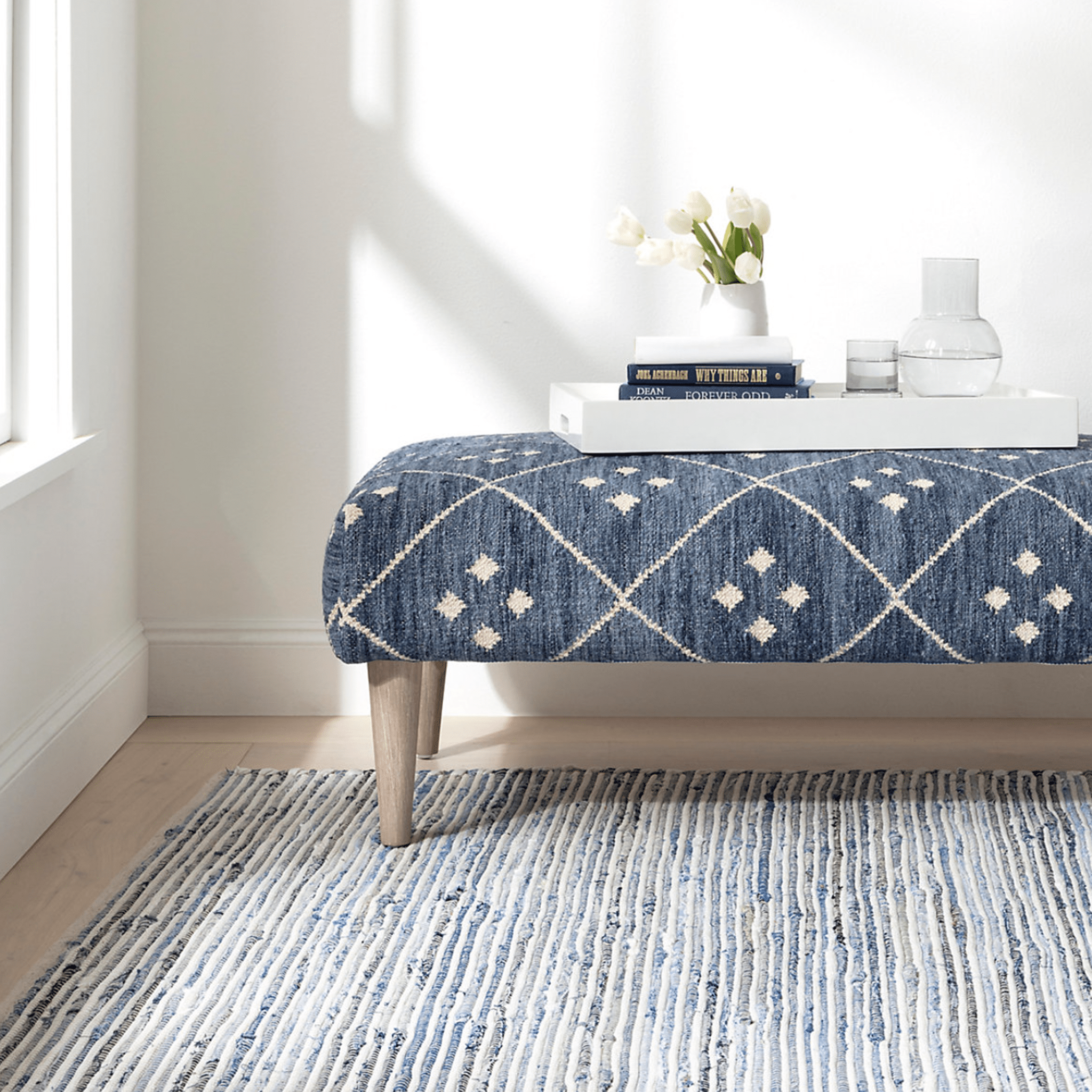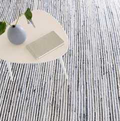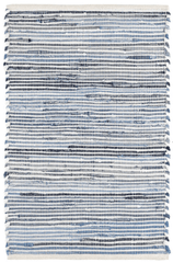 The Denim Rag is a simple style with indigo strata of repurposed cotton jeans and twill fabrics. Simple stripes in all shades of Denim, Indigo, Ice and White rag bring a casual, coastal cottage-like note to any spot where you need a little underfoot padding.