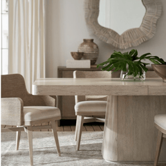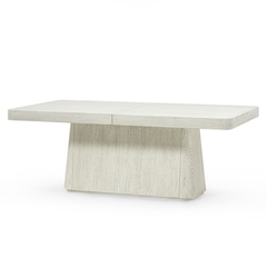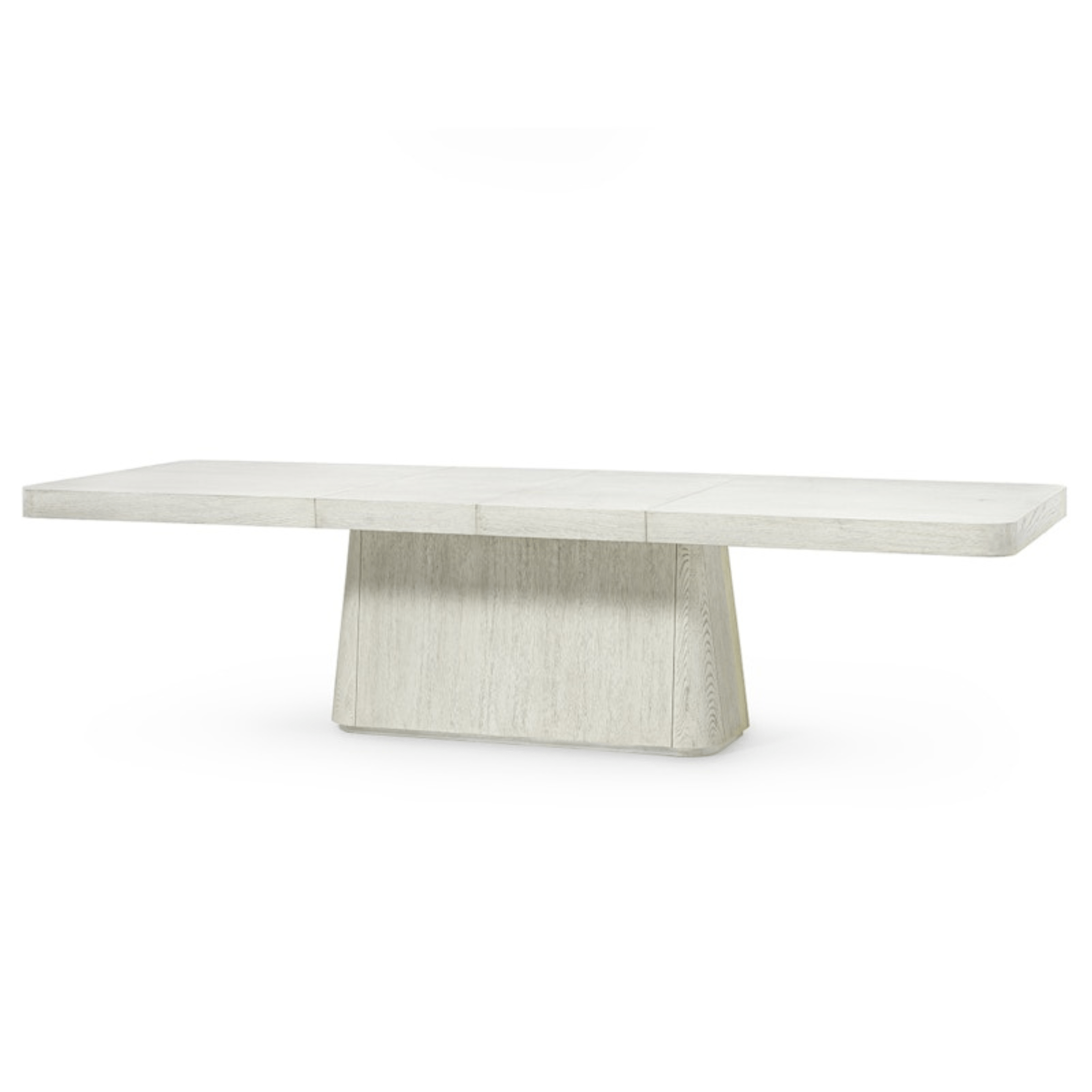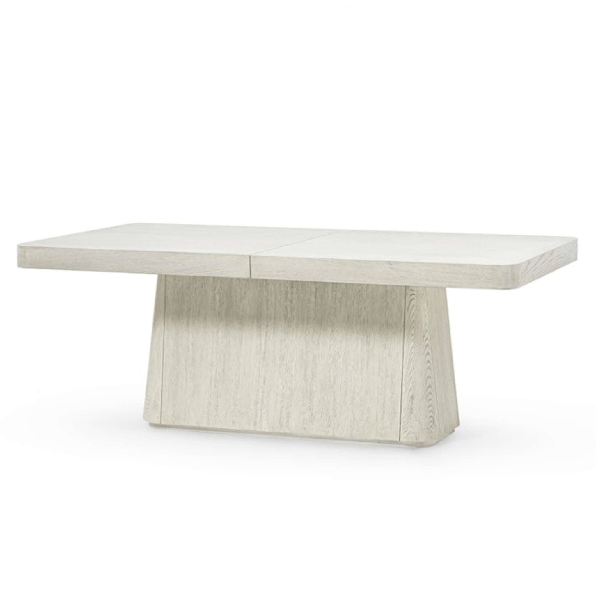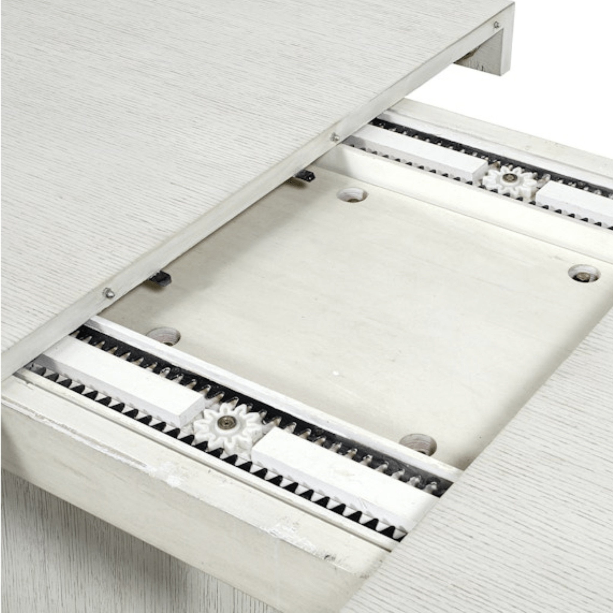 Hardwood frame and legs with whitewash open grain finish. Table comes with two removable leaves and a rack and pinion table slides mechanism. Use placemats or trivets under hot items and coasters to prevent marks and stains.