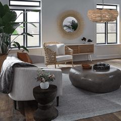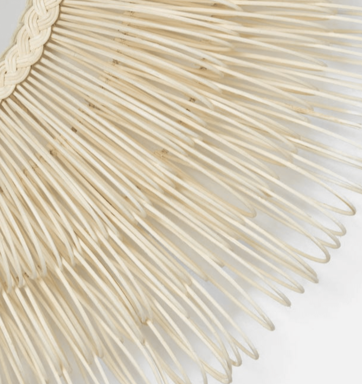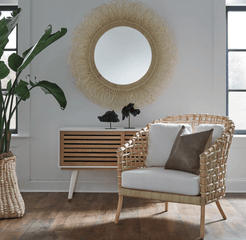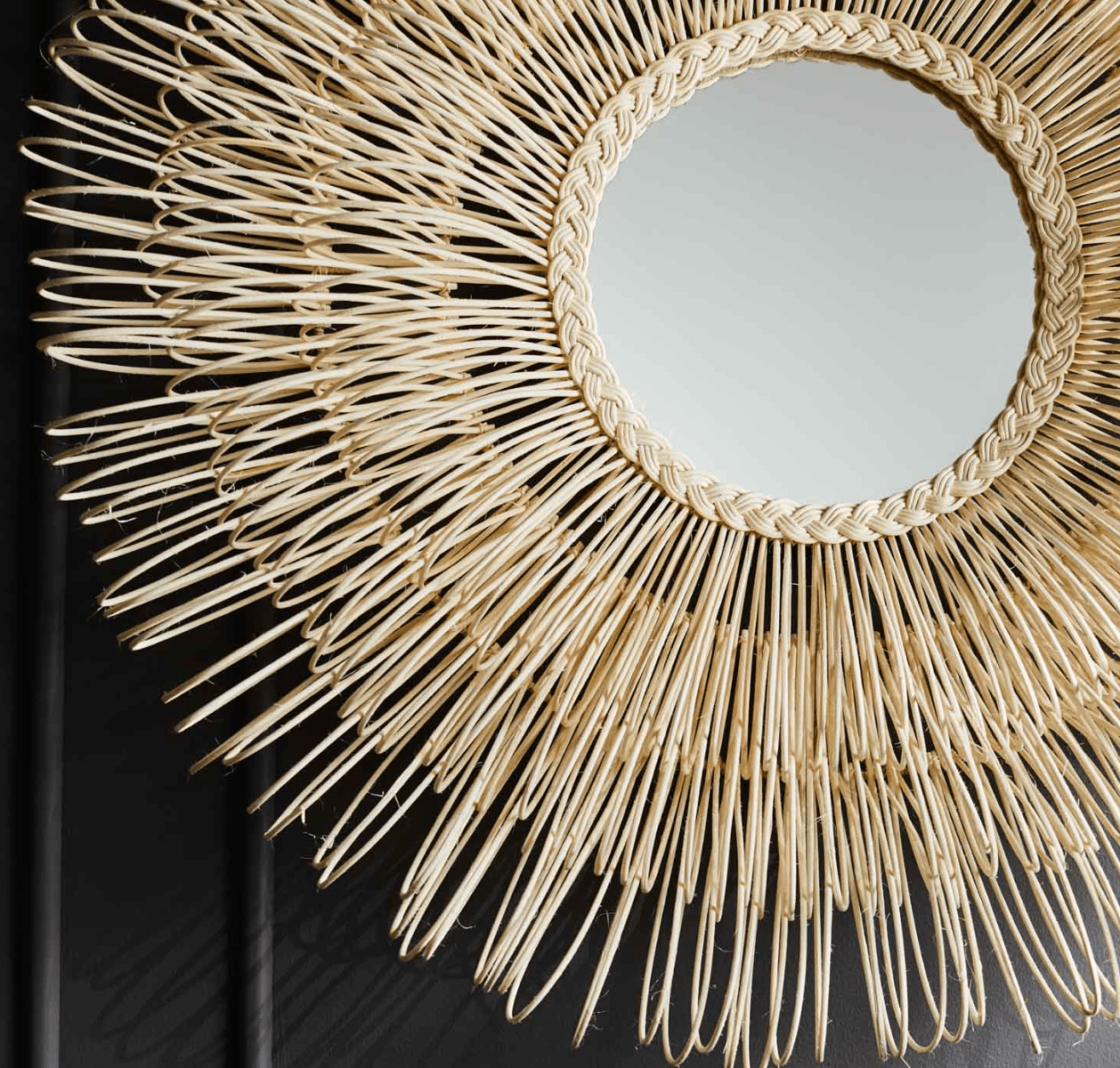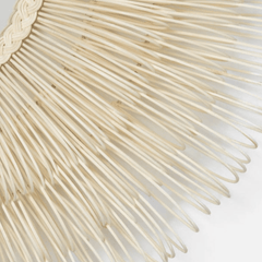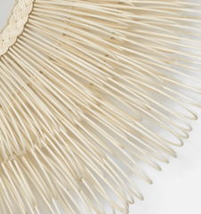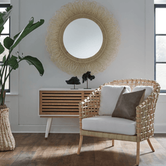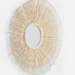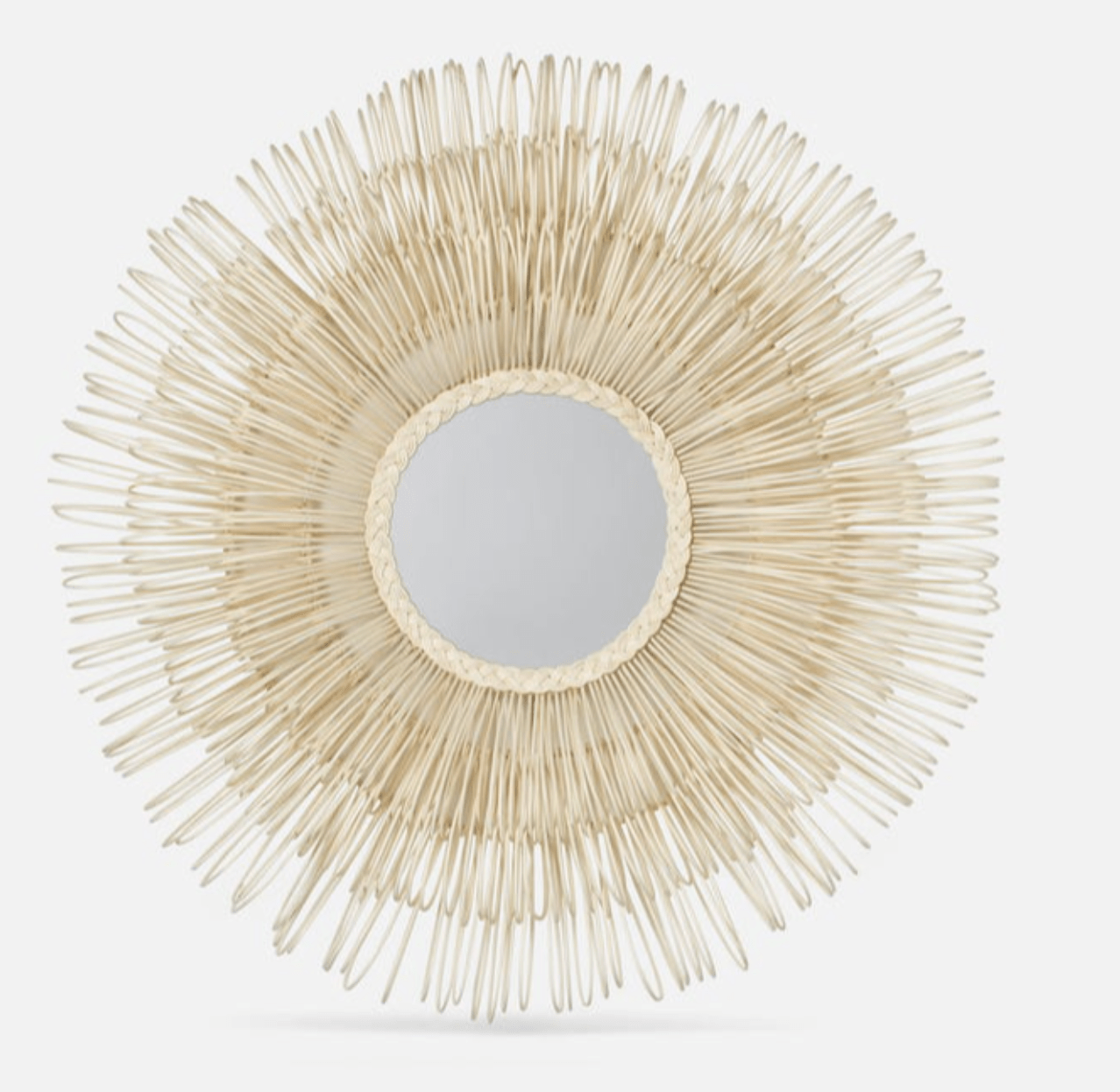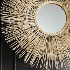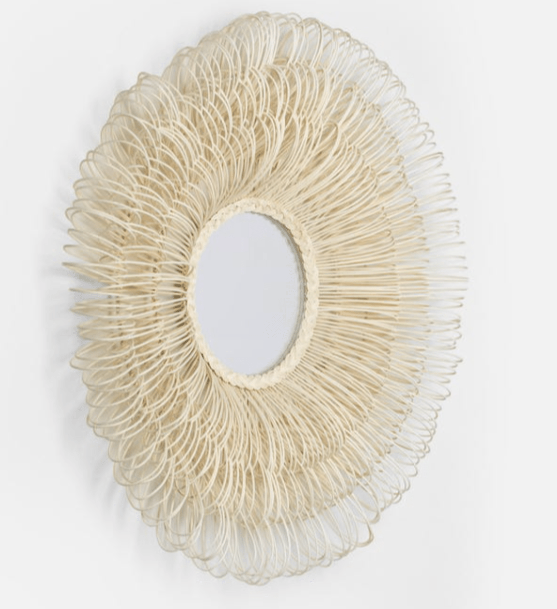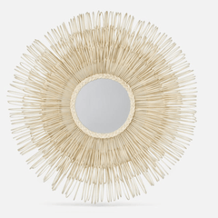 Dense layers of hand-looped natural rattan surround the Eliza White Cane circular mirror. This mirror has arching sun-spray of loops forming a profile depth of approximately 7.25''. It's perfectly coastal in style and unique in texture.