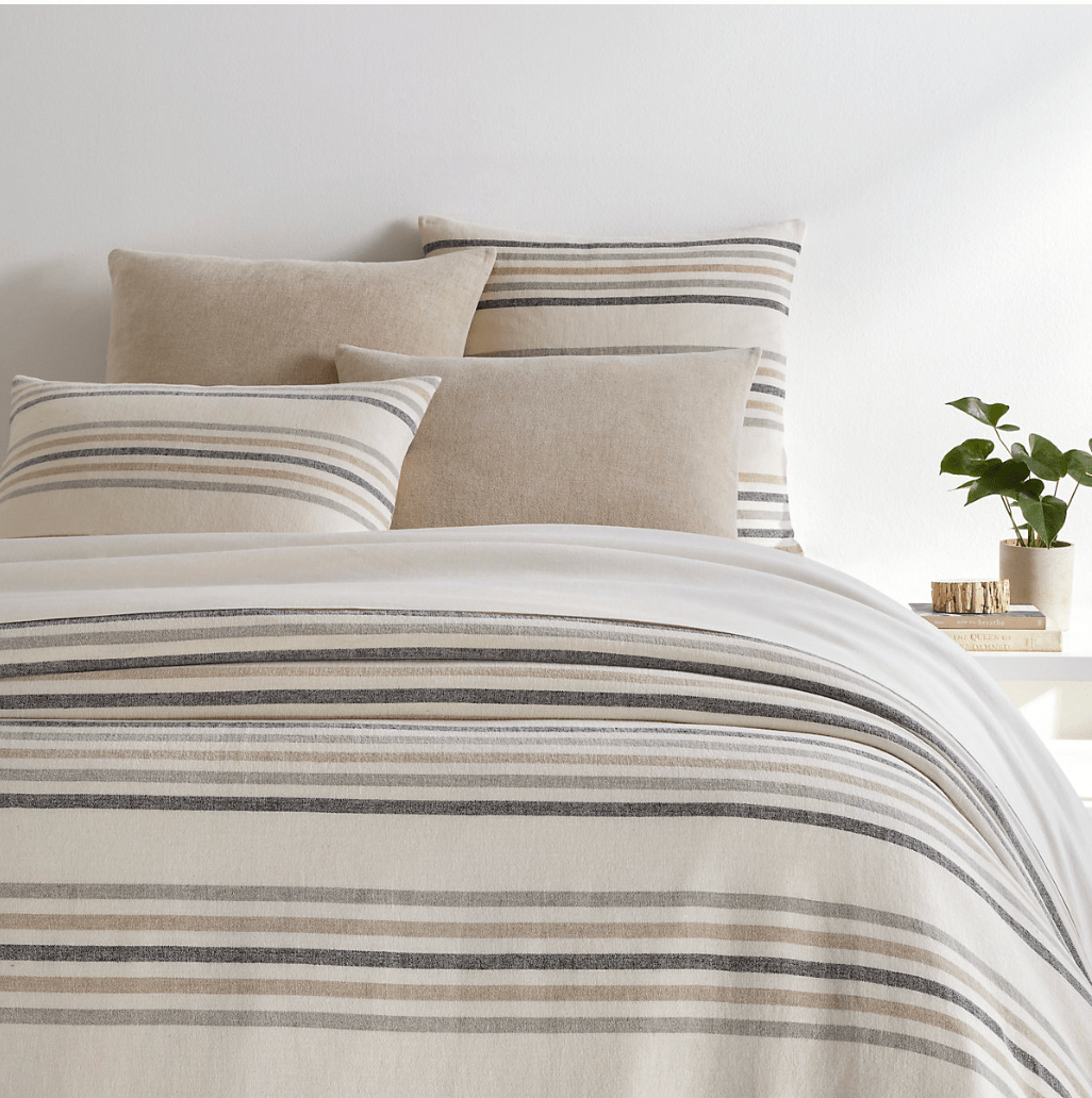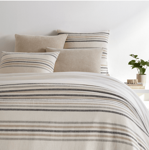 Soft to the touch with a fantastic drape, our luxurious linen chenille duvet cover adds a modern graphic edge in Charcoal, Grey, and Natural stripes in Ivory. The subtle suede texture is woven from velvety chenille yarn in a fantastic blend of cotton for softness, linen for texture and strength, and viscose for a silky drape.