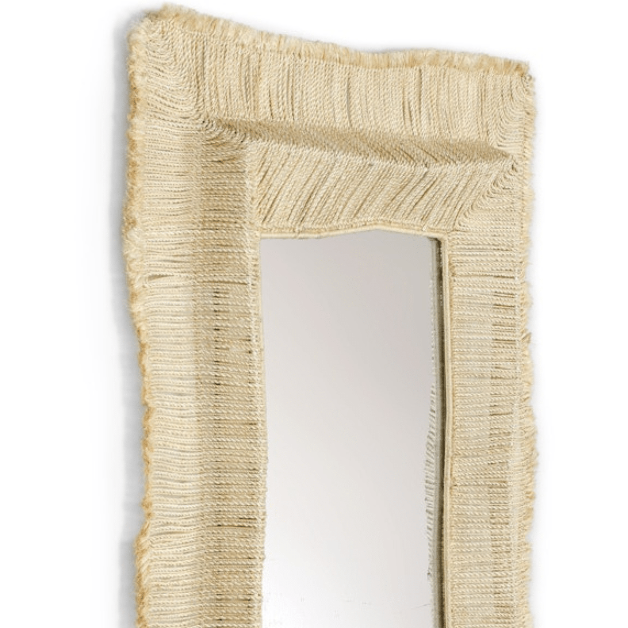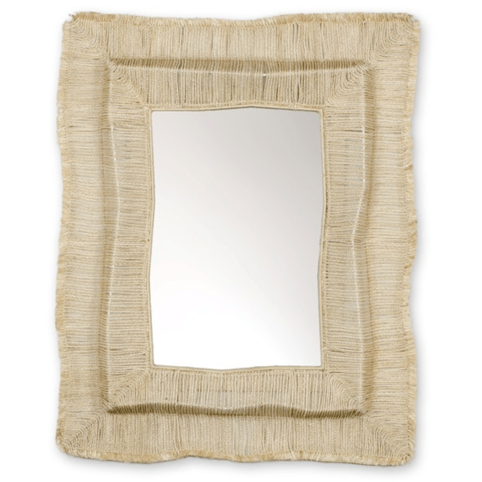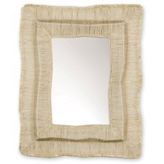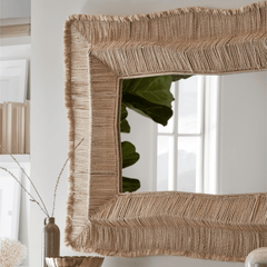 Mirror features natural abaca rope and raffia straw hand-twisted with fringe and details placed over a slightly curved powder metal frame. Mirror comes with metal hangers for mounting both vertically and horizontally.