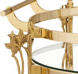 A beautifully crafted Bar Cart is what the Florence has to offer with lovely floral motifs flowing up each of its legs toward a metal band into which a glass top is inset. Just above the graceful ball-shaped feet fitted with non-marring casters sits a natural white marble shelf, the stone a crisp contrast to the luminous polished brass finish.
