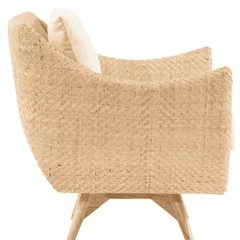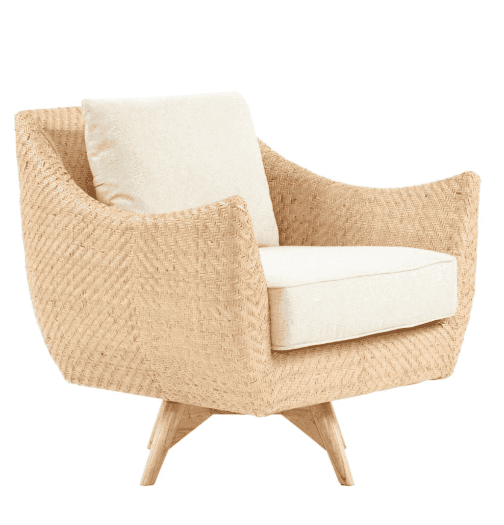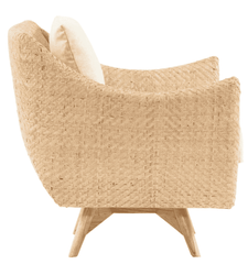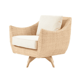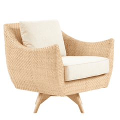 Perfectly neutral, beachy and clean, the Gabriola Swivel Chair is crafted from mahogany wood, sealed in its natural state and finished with a seat with a woven rattan diamond weave pattern. Excellent chair for the living or family. Use solo or work well in pairs with an accent table.
