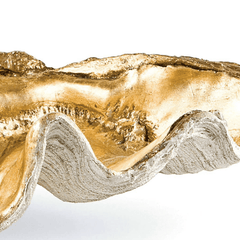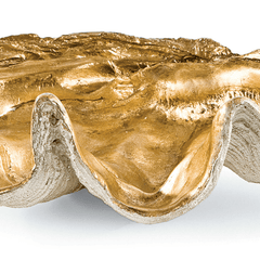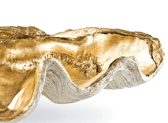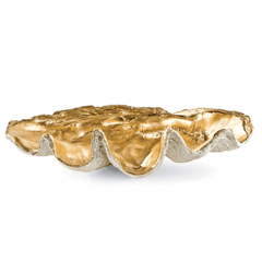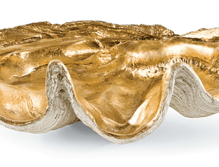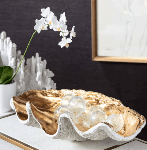 A large clam shell with gold interior works as a decorative bowl with beachy charm. Position on an entryway table or living room table to hold objets or other important items. Also available in a smaller size.