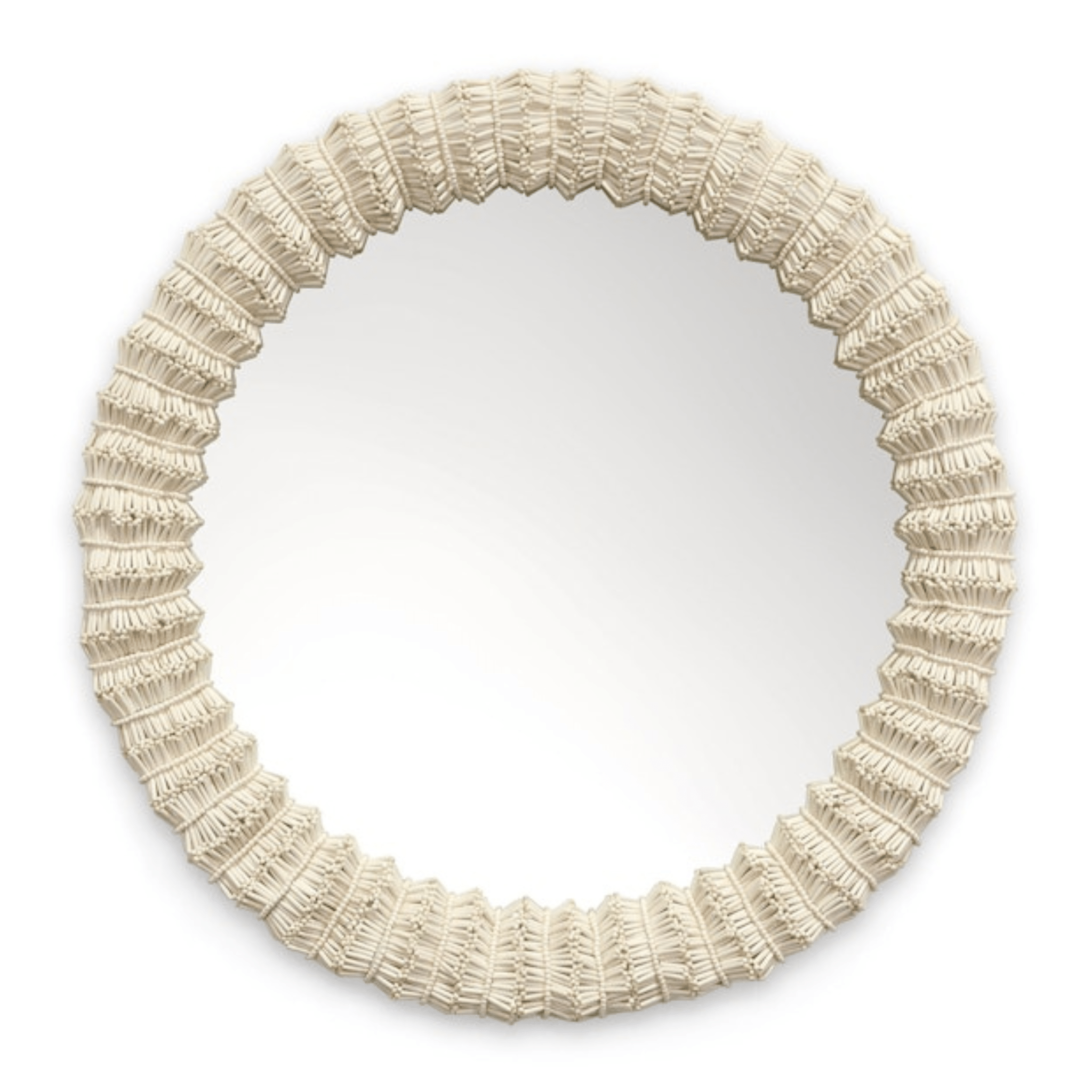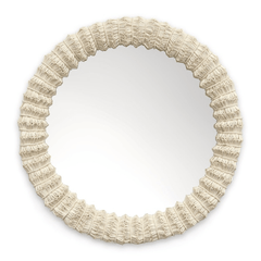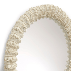 Cylindrical wood beads hand-sewn in a unique design over a metal frame.
