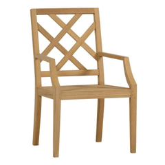 The Haley Arm Chair is a classic. Made of durable, marine-grade teak, it features a traditional latticework back and finely detailed armrests. The simple elegance of the Haley Arm Chair makes it a perfect choice for any outdoor dining room.