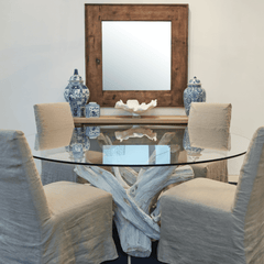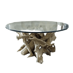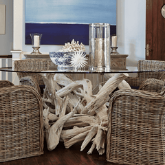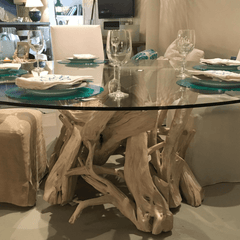 Beautiful, unique and one-of-a-kind our driftwood furniture pieces are made from authentic, real driftwood found along the shoreline and river banks. It is hand-selected per piece then clean, white washed or left natural then lightly sealed. The pieces are made into a uniquely shaped base created to support the size of glass requested.