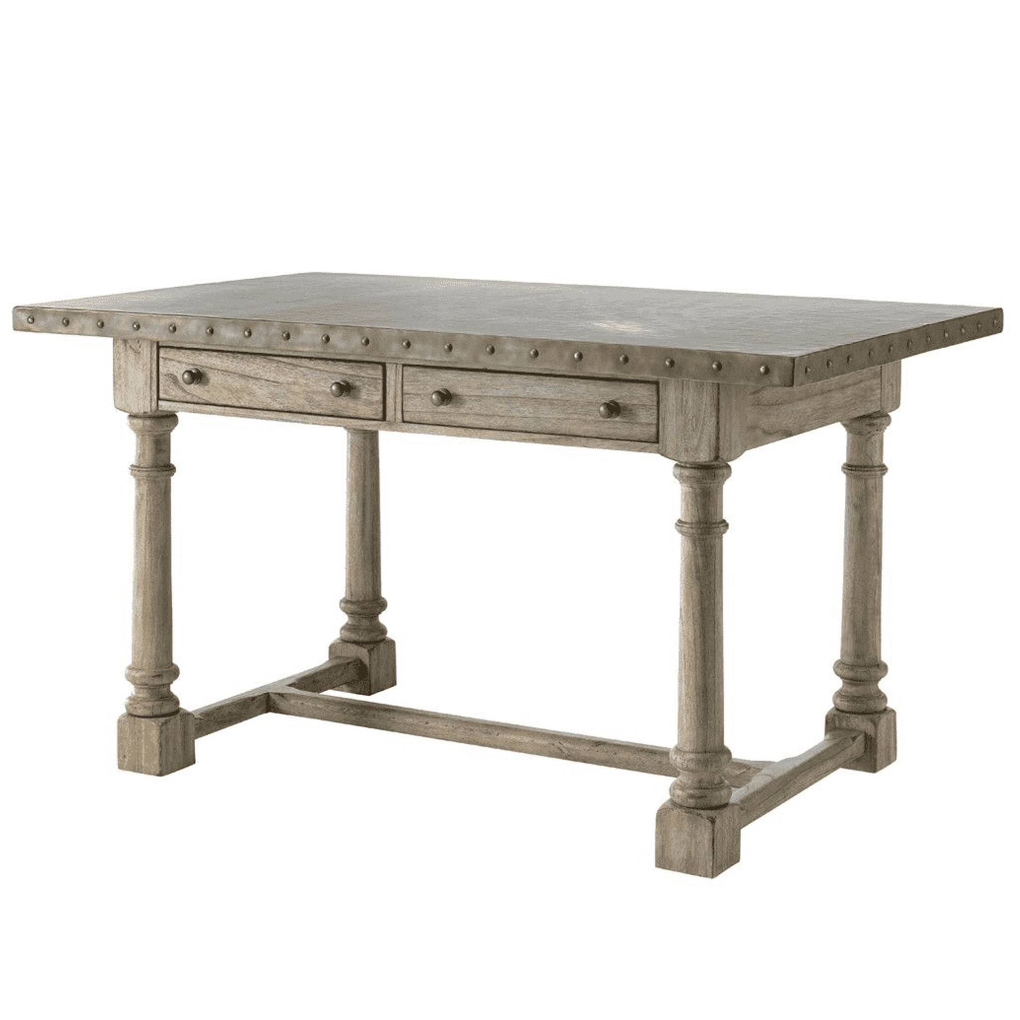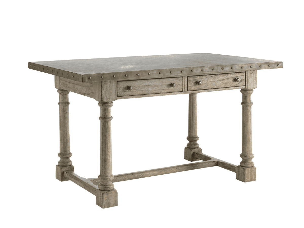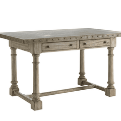 Hamlin Gray Pub Table has a hammered steel top with pewter nailhead trim in a pleasing graywash driftwood finish. There are four drawers total for storing dining linens and utensils. Also makes a great dining or work table.