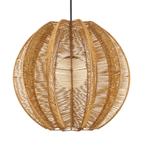 The Harbor Ridge Fluted Outdoor Pendant is made of all-weather wicker that can easily withstand the elements, as will the rod from which it hangs in a black powder-coated finish. An artisanal aspect of this tan pendant is the intricacy of the uniform weave hand-tied to create the starfruit shape of its profile. The milk-glass globe on the one-light pendant will illuminate the shade to reflect textural shadows on nearby surfaces. The fixture is wet location-tested so it is ideal for lighting patios and porches.