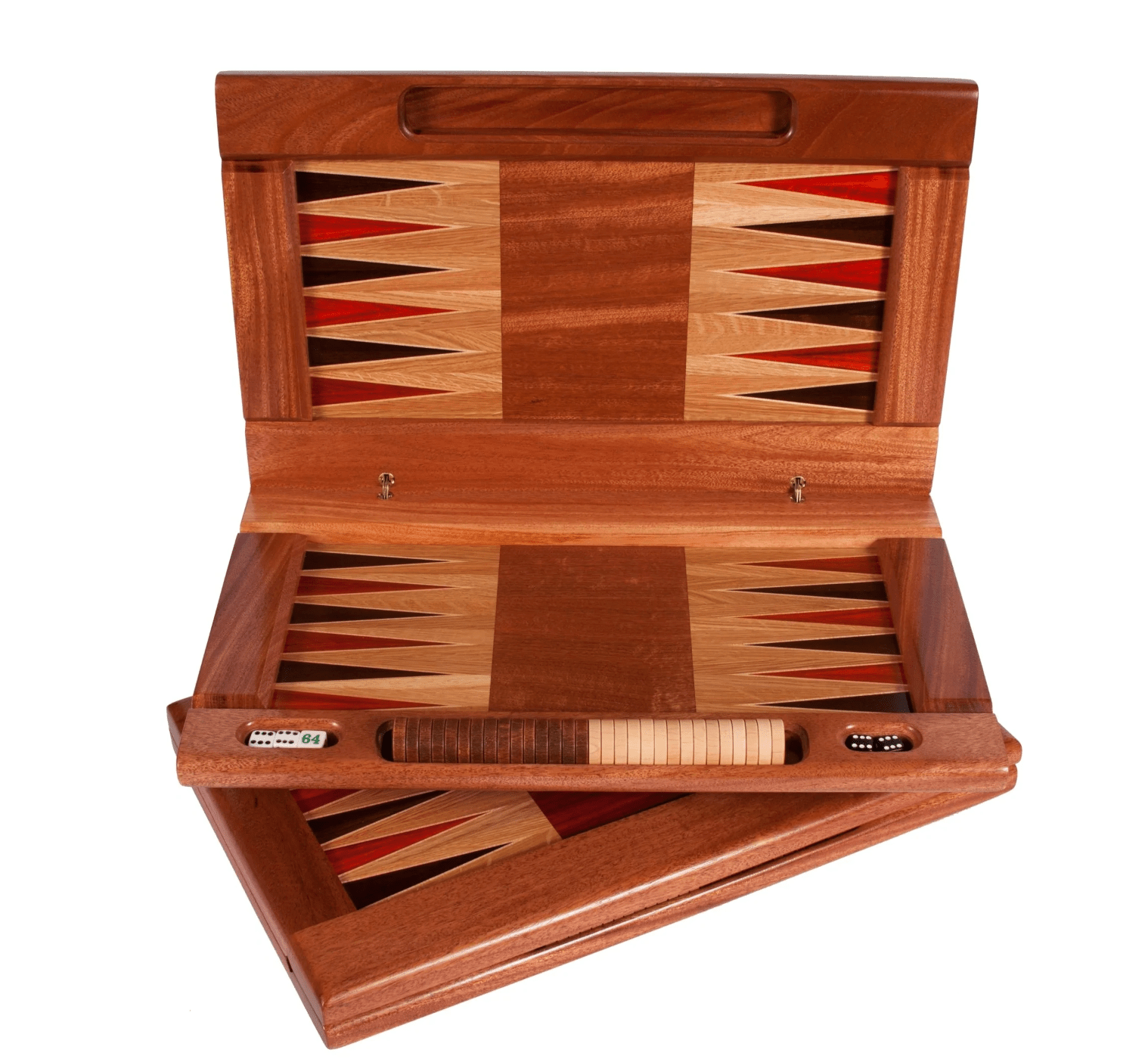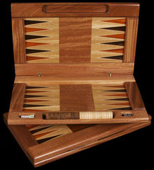 This beautiful Backgammon Set is constructed of the finest laminated, exotic & domestic hardwoods. This board is functional art that is made to sit on your coffee table when not in use. The hardwood playing pieces are made of Maple & American Walnut. Peruvian Walnut, African Padauk, African Sapele, Maple and White Oak are used in the boards.