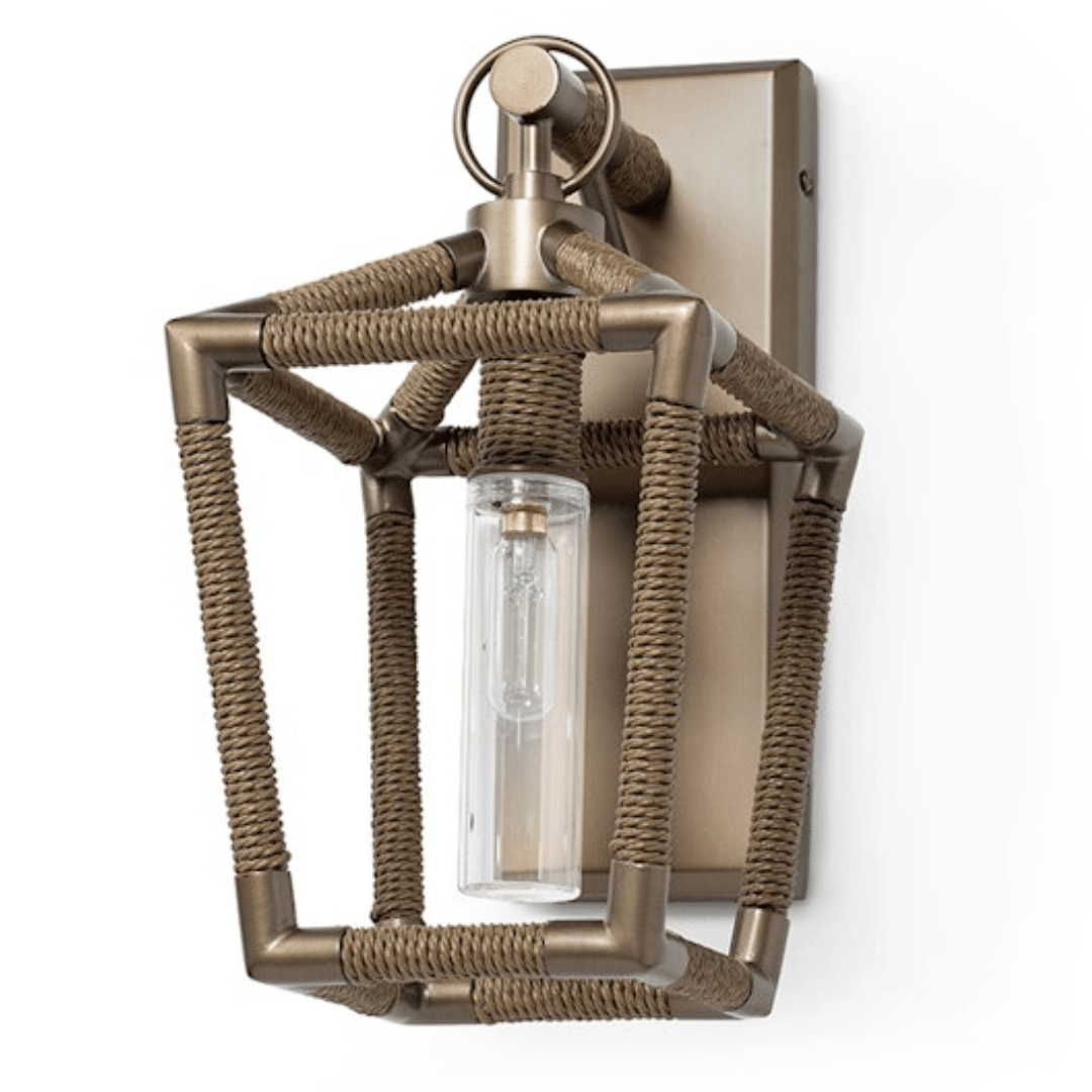 Synthetic rattan twisted to resemble rope is hand-wrapped over a lantern style powder coated aluminum frame, accented with light bronze details and backplate. Sockets are enclosed in glass globes for protection against water. Suitable for outdoor use in a wet location.