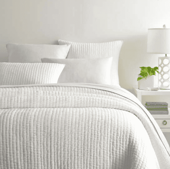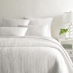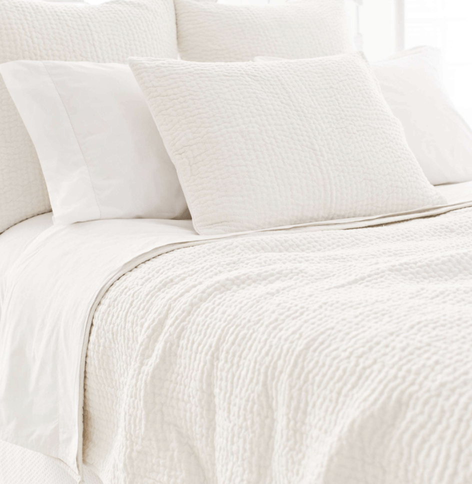 Breezy cotton voile on the front and back plus a thin layer of batting tied together with traditional hand stitched quilting channels creates the perfect spring to summer seasonal cover.