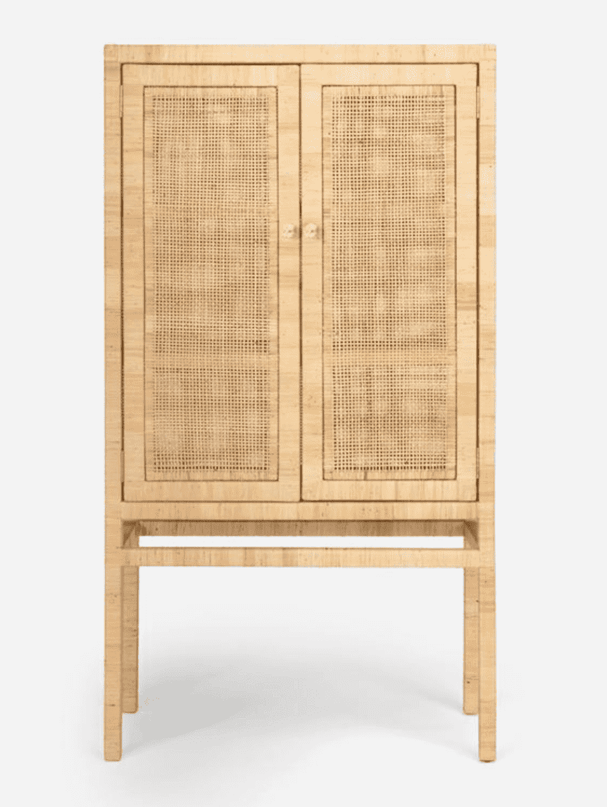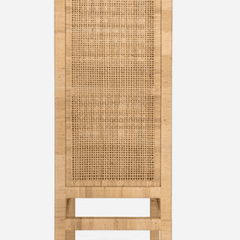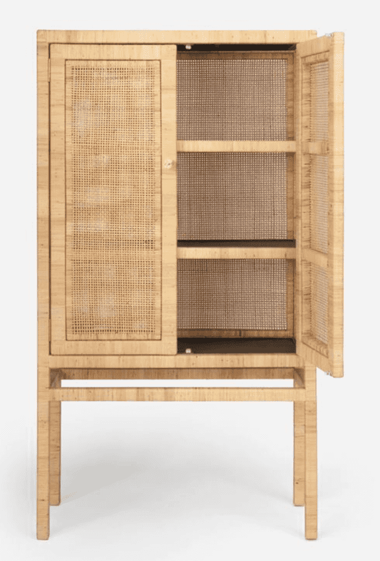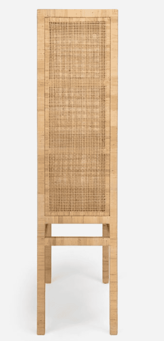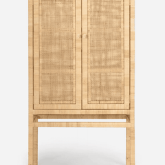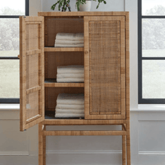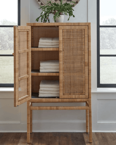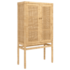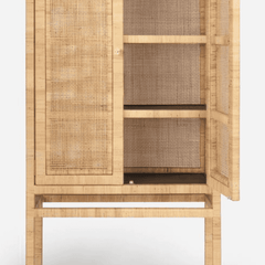 The Islamorada Cabinet is crafted from tightly wrapped, natural peeled rattan frame complements the dense basket weave of the natural peeled rattan sides and the slightly looser basket weave of the doors. Three fixed wood shelves, with tightly wrapped natural peeled rattan edges that mirror the cabinet's exterior structure, complete its well-tailored design.