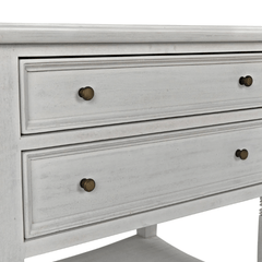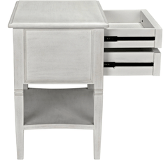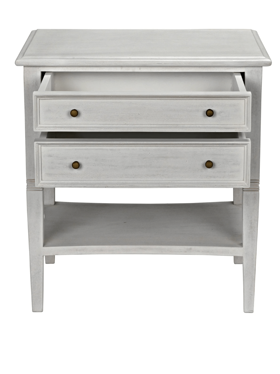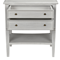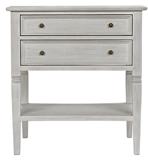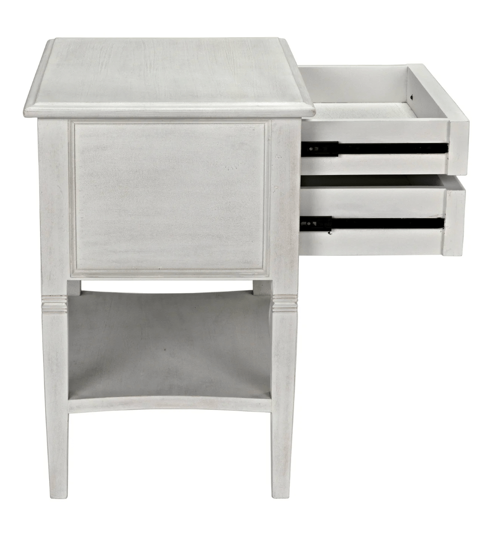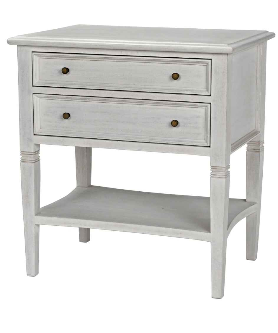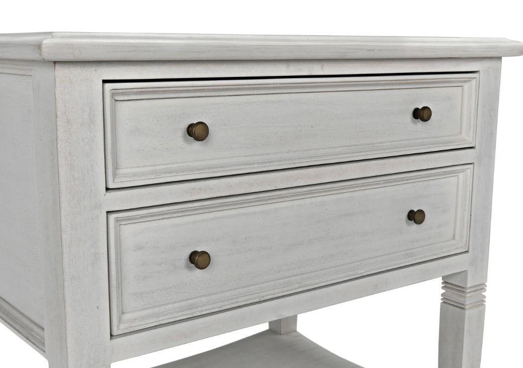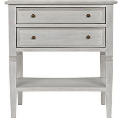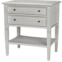 A white wash finish from natural paint gives an antique appeal to the mahogany wood on the Jensen side table. Clean lines and subtle details make this a versatile piece that will compliment any bedroom or use as a side table with any sofa. Two drawers and a second tier offer plenty of storage.