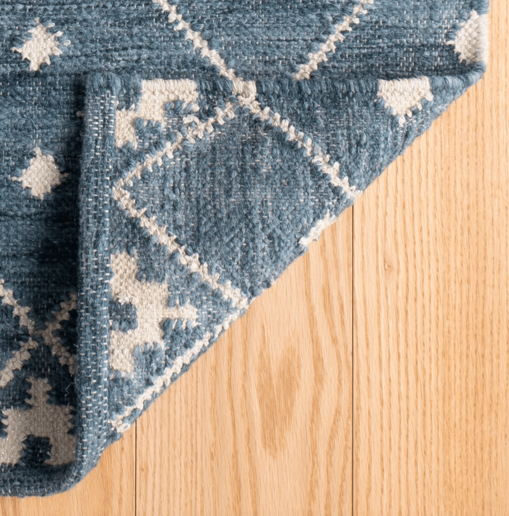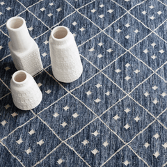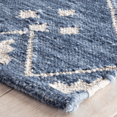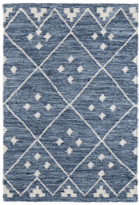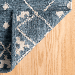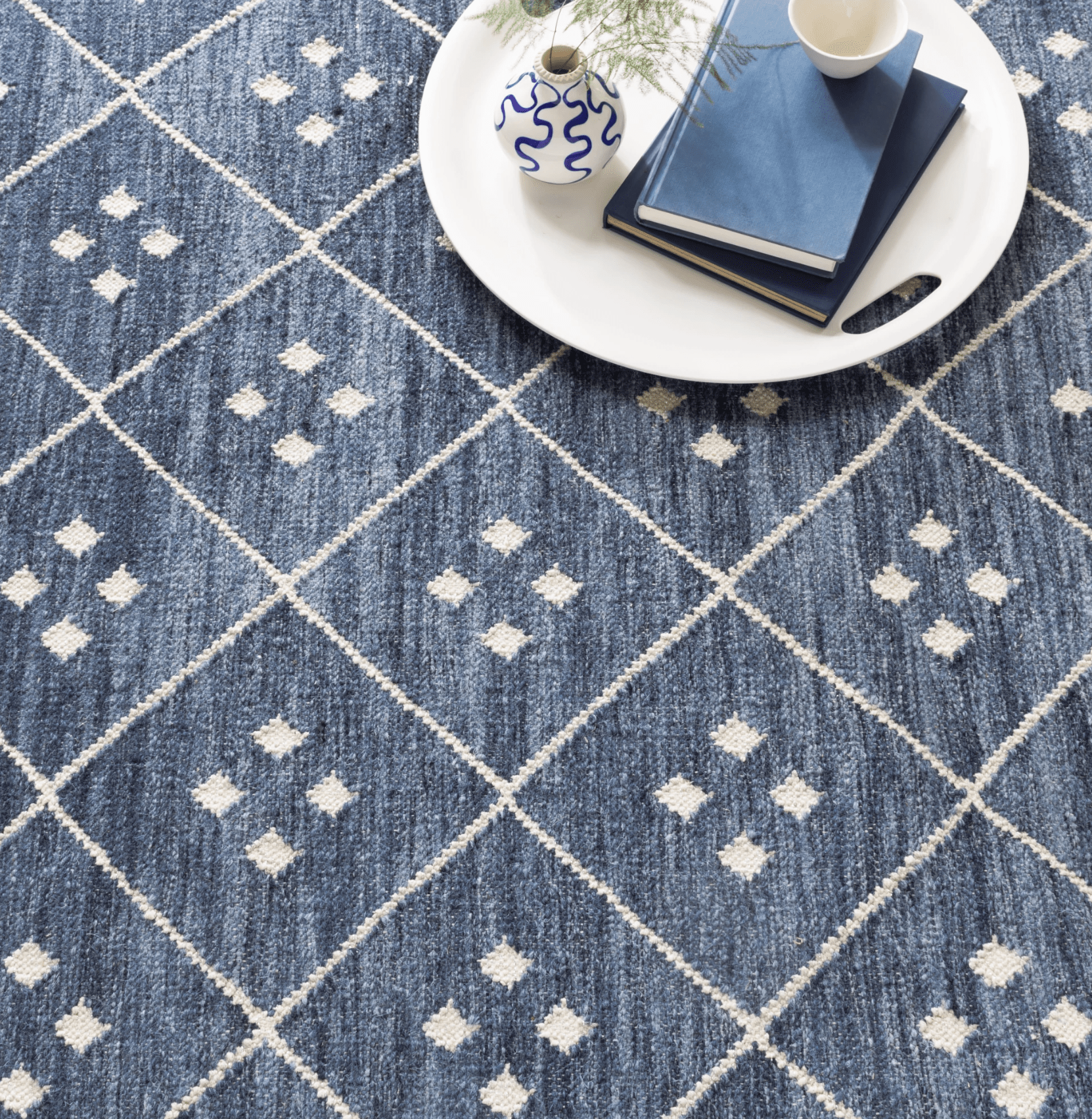 The Kota Handwoven Wool Rug has a bold, geometric pattern and a subtle, metallic silver thread woven throughout its indigo base. This rug is low-profile and durable, perfect for homes with kids and pets and high-traffic spaces, like hallways and living rooms.