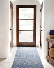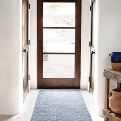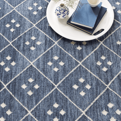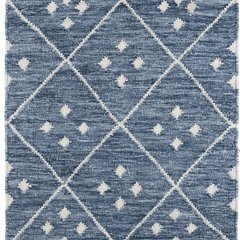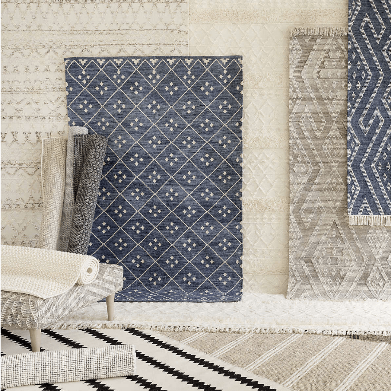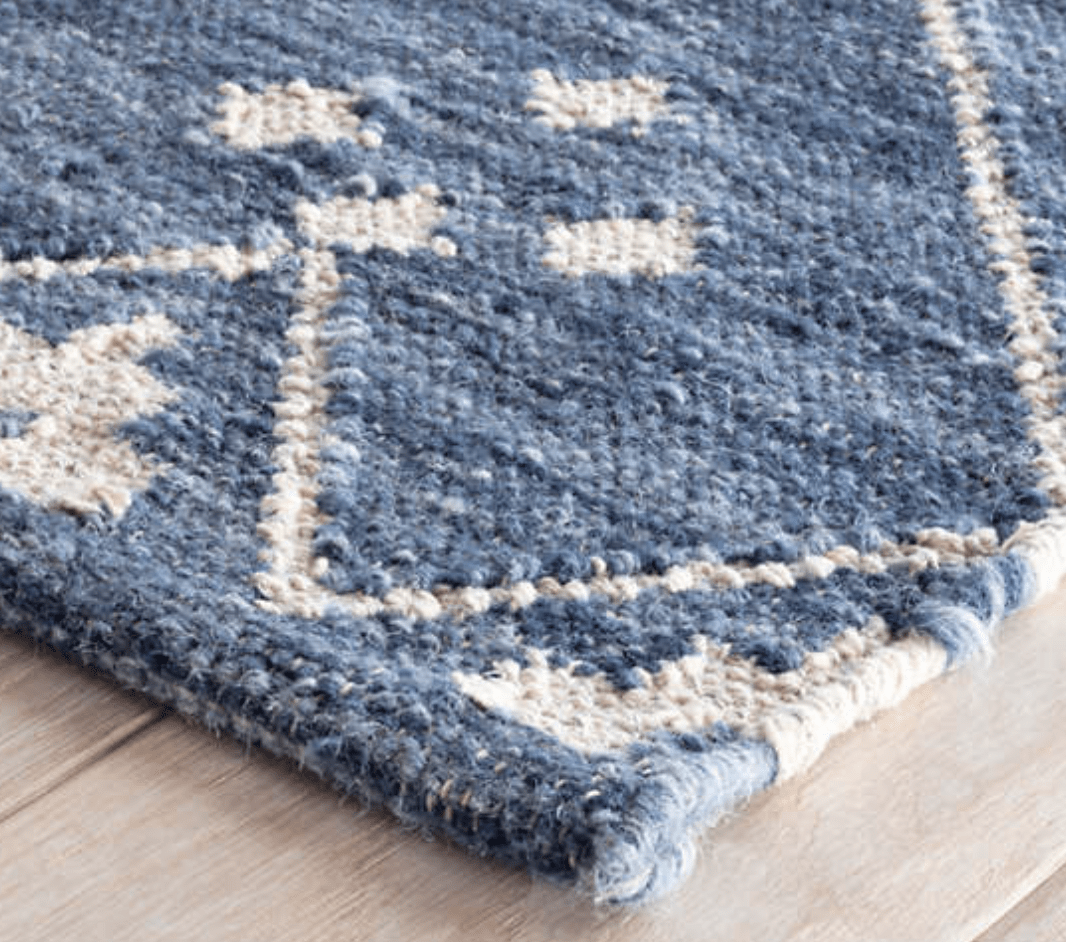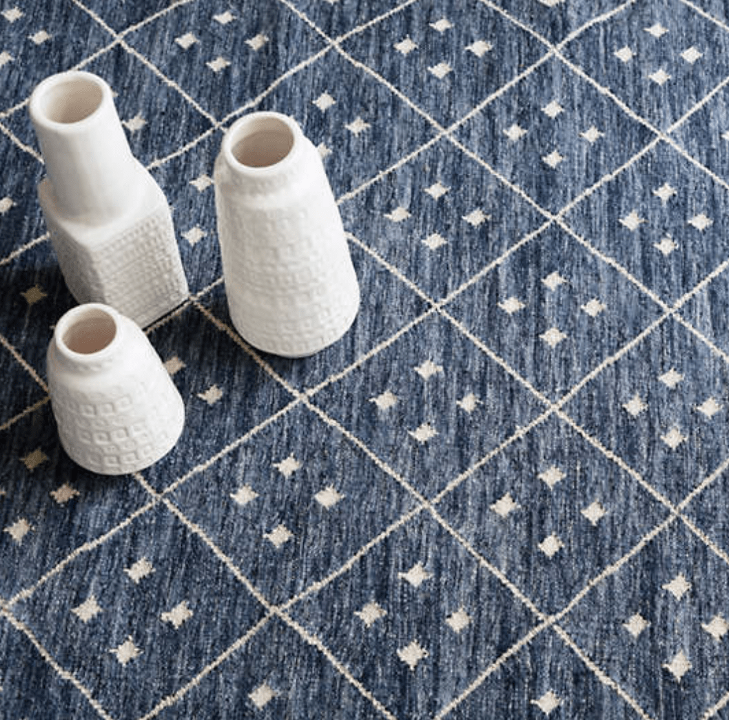 The Kota Handwoven Wool Rug has a bold, geometric pattern and a subtle, metallic silver thread woven throughout its indigo base. This rug is low-profile and durable, perfect for homes with kids and pets and high-traffic spaces, like hallways and living rooms.