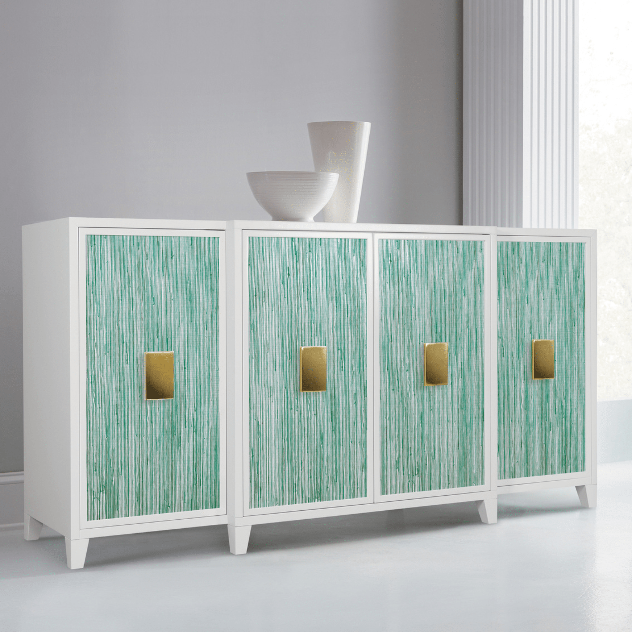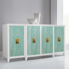 A striking blend of modern elegance and coastal charm, this credenza features a crisp white frame accented by textured turquoise grasscloth panels. The bold brass hardware adds a touch of sophistication, while the clean lines and tapered legs create a refined silhouette. Perfect for adding both style and storage to any space, this piece brings a fresh, breezy feel to your home.
