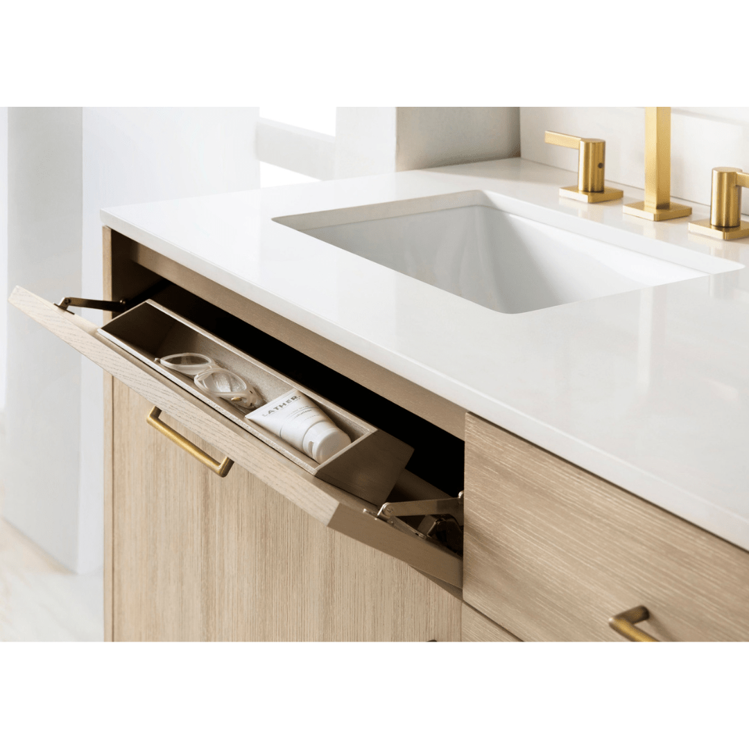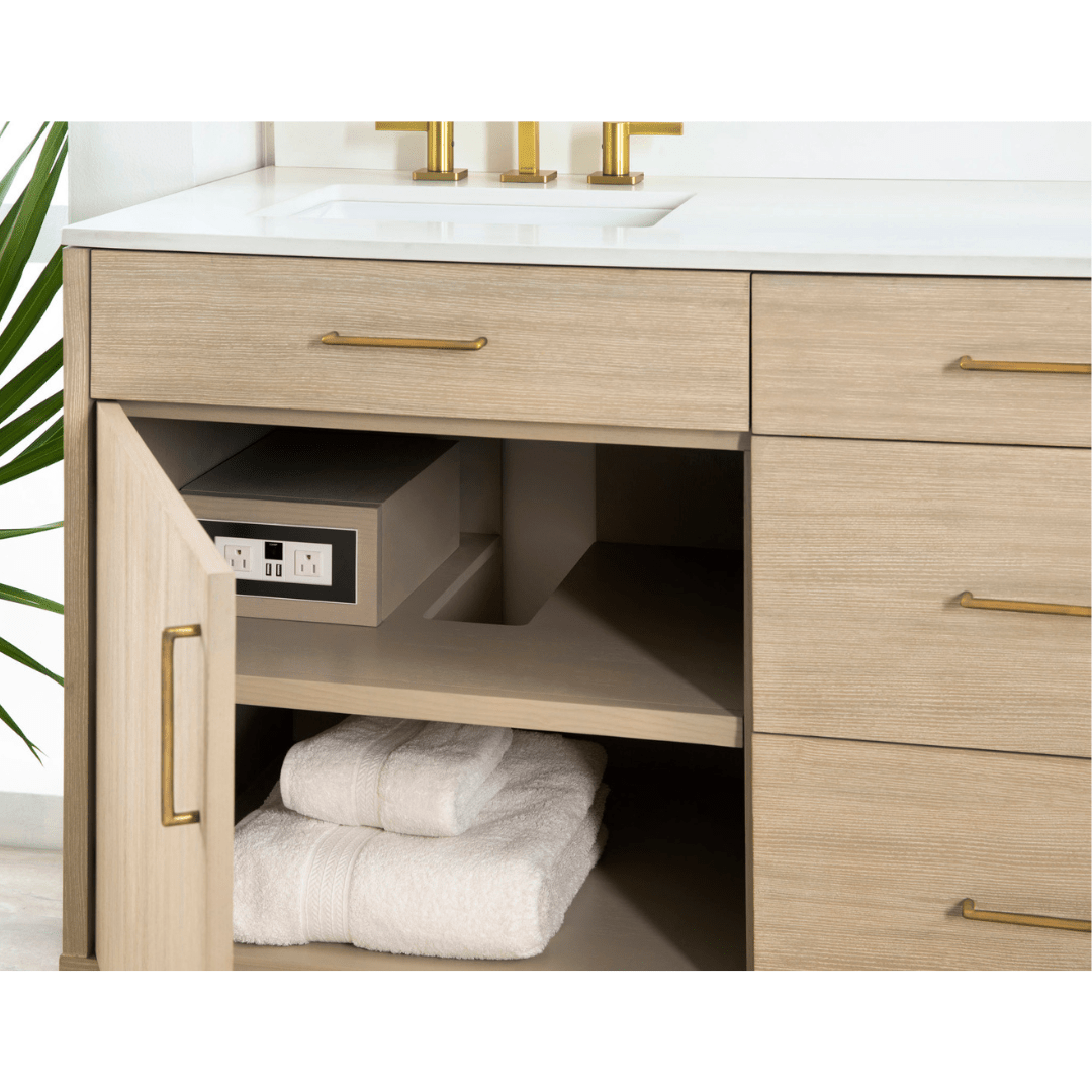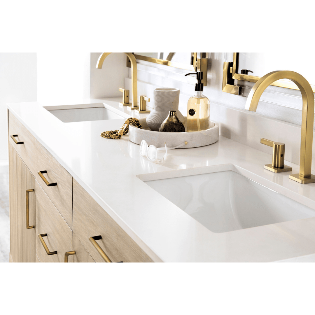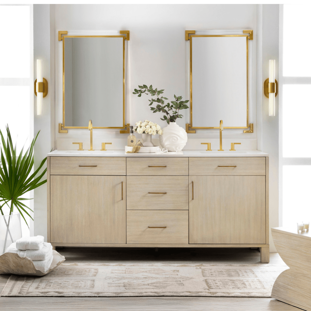 This double-sink vanity blends modern minimalism with natural warmth, featuring a soft wood finish, clean lines, and streamlined brass hardware. A white marble top adds a touch of luxury, while ample storage keeps essentials neatly tucked away.