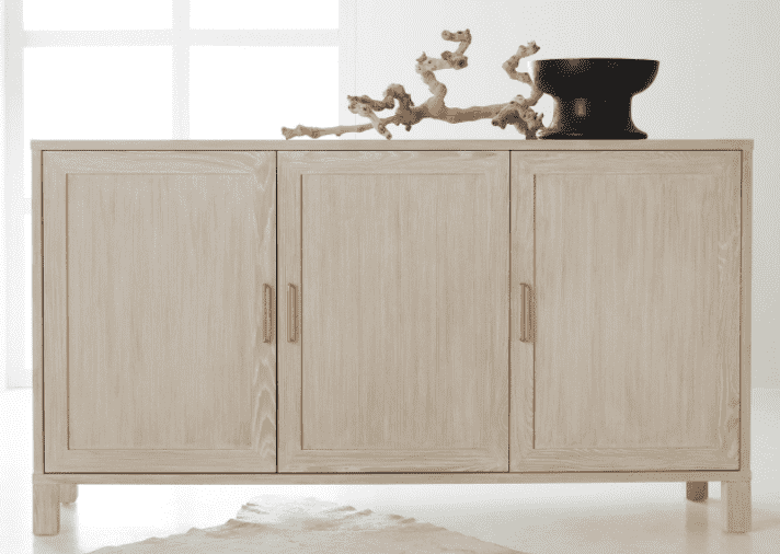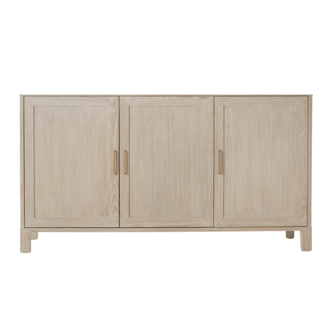 Finished in a Ashe Veneer, the Laurel Grove Credenza has three solid oak doors. Left side has a pair of bi-parting doors and the right door is right hinged, opening left. Each door is adorned with modern brass straight pulls with two adjustable shelves inside.