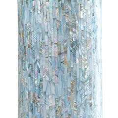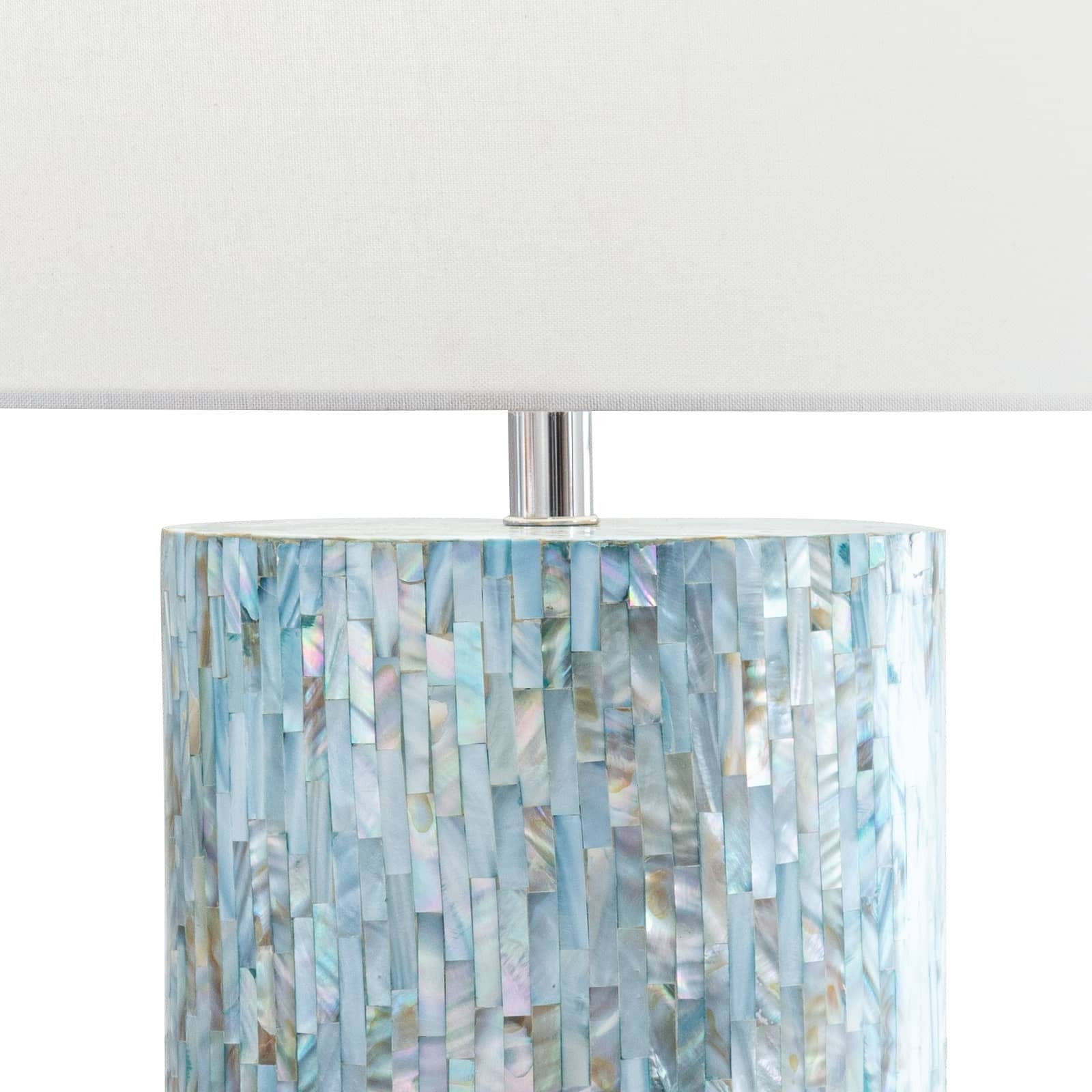 Like the shimmering light of the sun atop water, Layla's azure blue, mother-of-pearl tiles create the same dazzling effect. Place this modern column lamp in a seaside cottage or a contemporary loft. It is the perfect chameleon of style, adding a bit of drama and elegance to any space it dwells in. Finished with a classic drum shade in natural linen, this is the perfect, substantial lamp for an end table, bed stand, or entryway console.