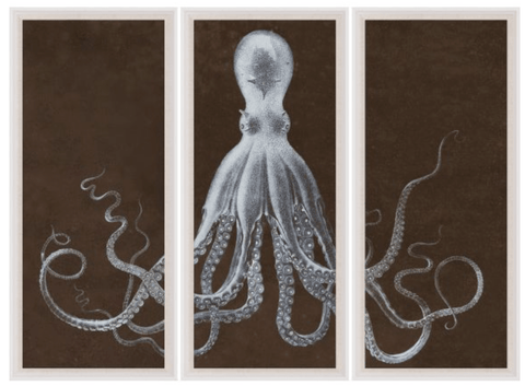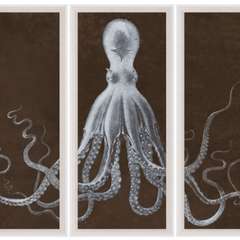 This captivating octopus art, titled "Lord Bodner in Brown Triptych", is sure to add intrigue to your coastal art collection. Originally taken from a classic detailed 1800's copperplate engraving. Framed artwork. Custom created. Can take 2-3 months to create.