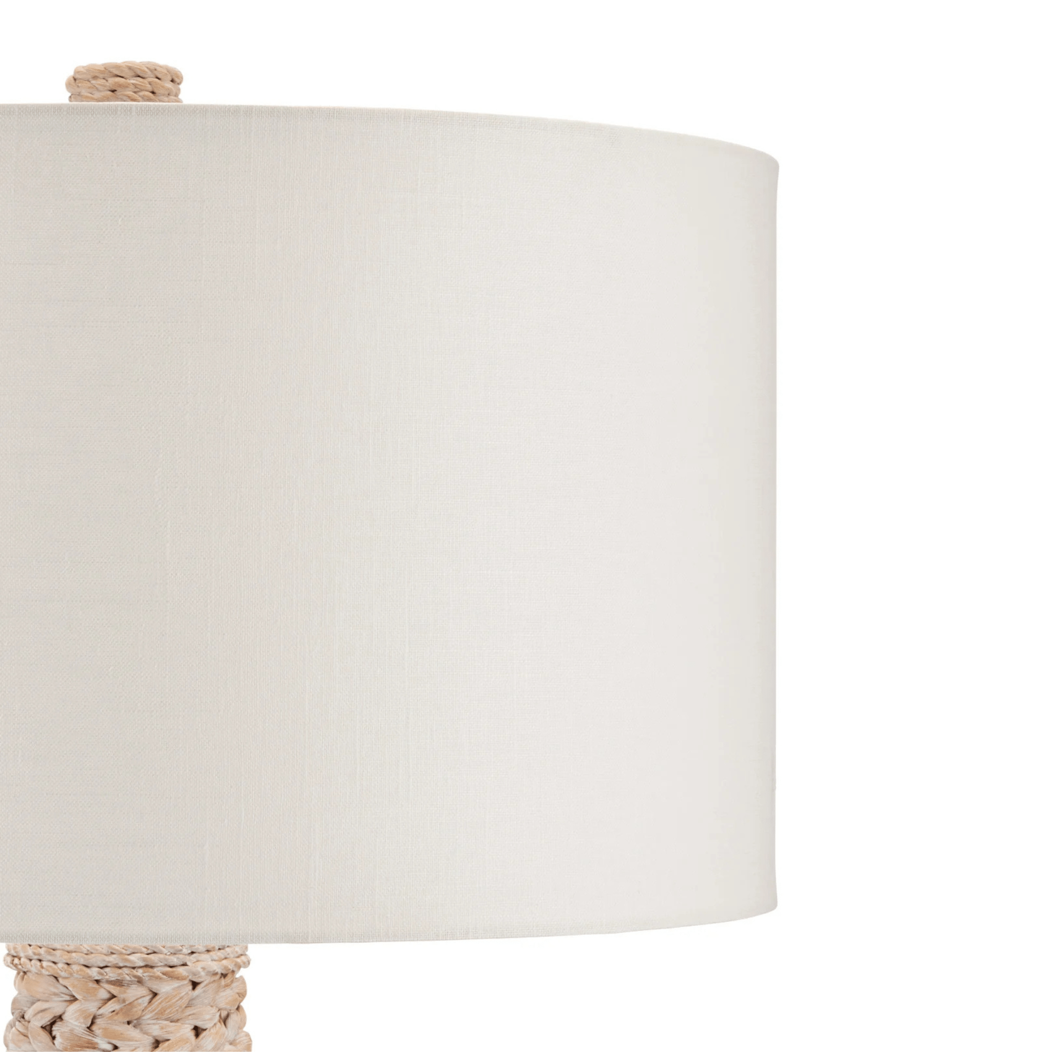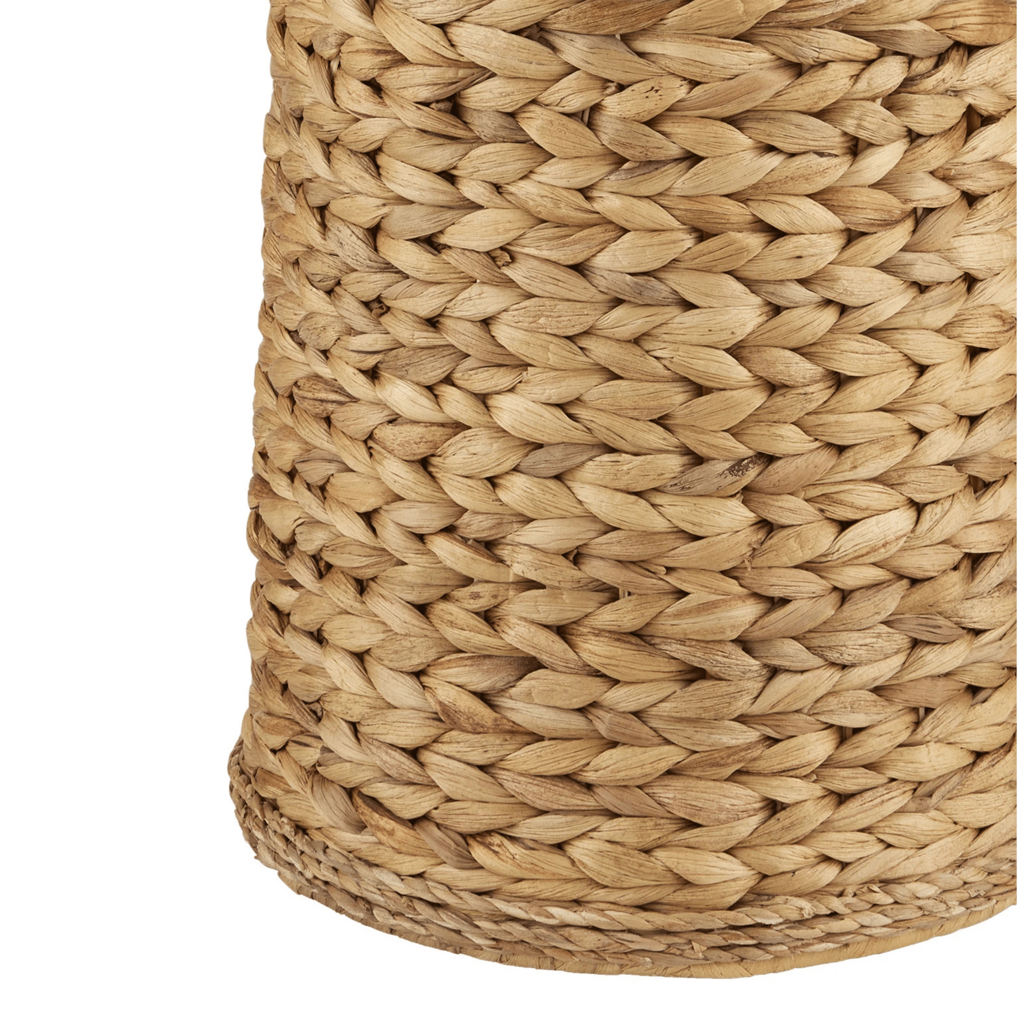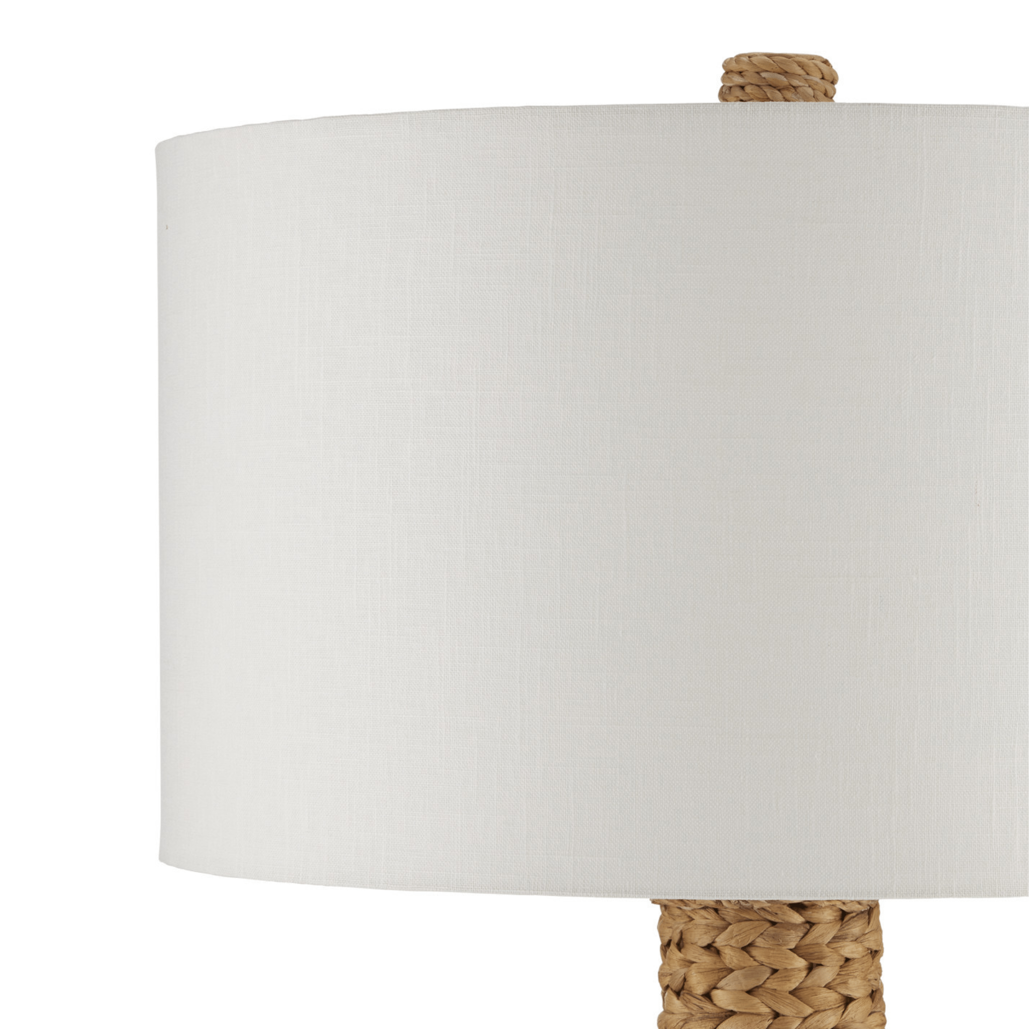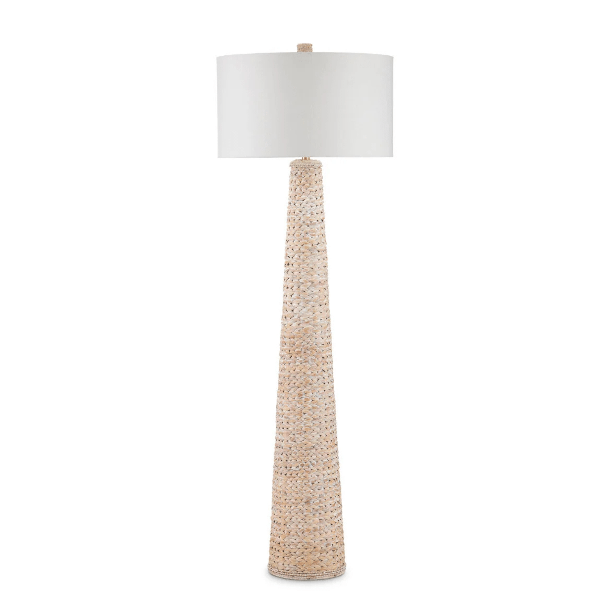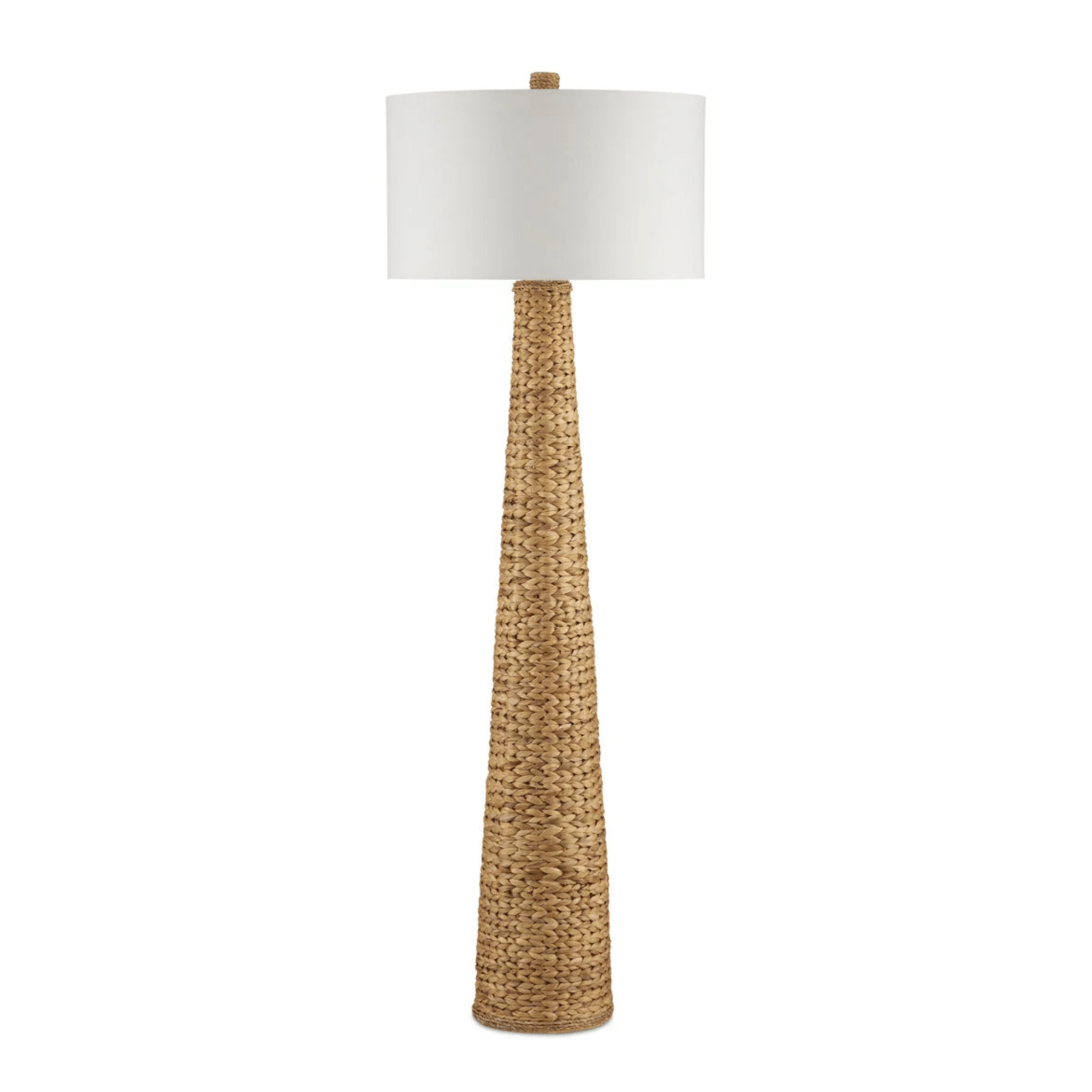 The knobby weave of water hyacinth that covers the Madagascar Floor Lamp takes an artisan a remarkable length of time to achieve to create such visual consistency. It is statuesque in scale and is a cohesive composition with its finial that matches its body. An off-white linen drum shade adds to the incredible texture this woven floor lamp exudes.